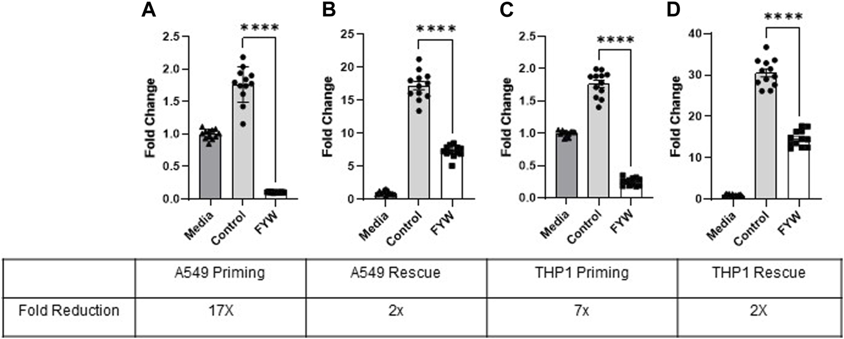 FYW led to significantly reduced IFN signaling in both the lung epithelial (A549) cells and monocytes (THP1) when challenged with various stimuli. We next asked whether pretreatment of these cells with FYW prior to additional stimulation (“prime”) would further reduce IFN signaling. Therefore, we treated both cell types with FYW for 48 h before exposure to influenza. We found a dramatic decrease in IFN signaling with a 17-fold and 7-fold reduction in A549 and THP1 cells (Figure 5), respectively. However, when the cells were first exposed to influenza for 24 h and then FYW added for another 24 h (“rescue”), the reduction was effectively lowered although not abolished with an approximate 2-fold decrease in IFN signaling in both A549 and THP1 cells (Figure 5). Murine primary cells also demonstrated similar findings with 2.3-fold, 1.8-fold, and 1.3-fold reduction in IFN signaling, respectively, in isolated alveolar macrophages, bone marrow cells, and peritoneal macrophages (Supplementary Figure S9). These results demonstrate that priming the cells with aromatic amino acid metabolites leads to a potent decrease in IFN signaling in multiple cell types.