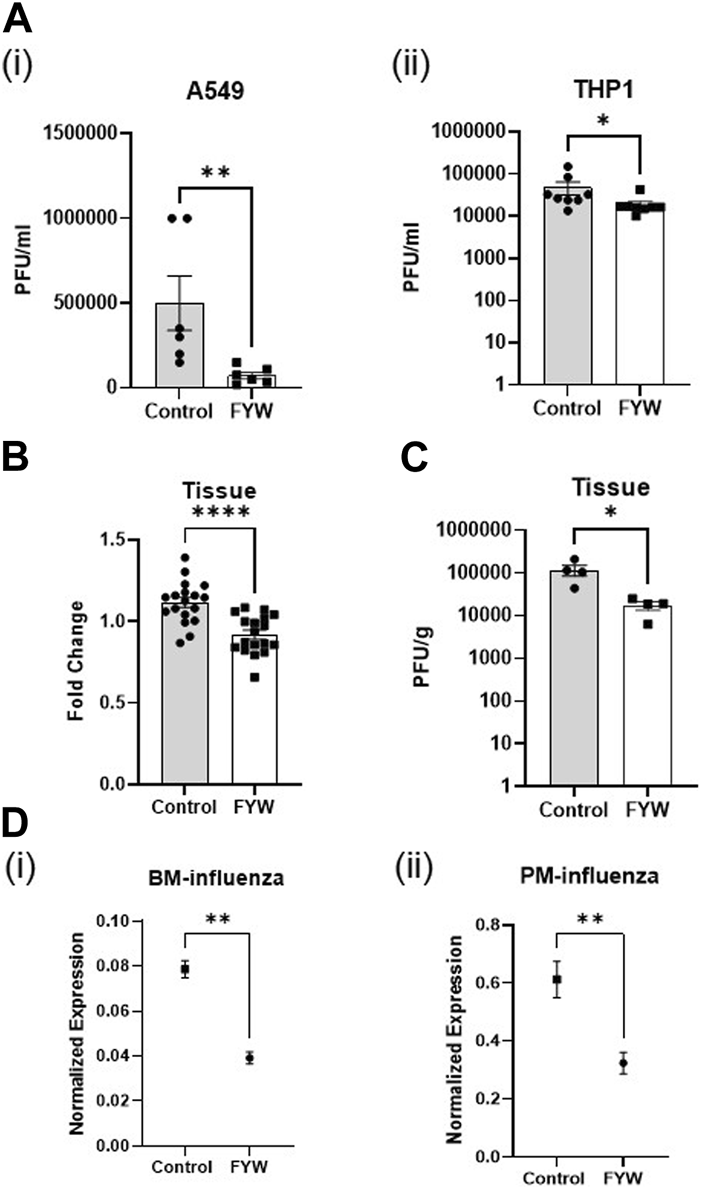 Pooled aromatic amino add metabolites decrease the infectious viral recovery. (A) Influenza plaque-forming units recovered from A549 (i) and THP1 (ii) cells pretreated with FYW for 48 h and then infected with influenza for 24 h. (n = 3 experiments; 6 biological and 12 technical replicates for A549 and THP1) (B) Fold change in IFN reporter activity in A549 cells at 48 h after treatment with supernatant from ex-vivo influenza-infected mouse lungs. (n = 2 experiments; 9 biological and 18 technical replicates for A549 and THP1). (C) Influenza plaque-forming units recovered from ex-vivo infected mouse lungs after treatment with FYW for 24 h. DMSO (volume matched) served as the control for the metabolites. (n = 2 experiments; 4 biological and technical replicates). (D) RNA expression from real-time PCR for influenza matrix protein in primary bone marrow cells (i) and peritoneal macrophages (ii) treated with the pooled metabolite combination FYW for 24 h and infected with influenza for 24 h (n = 2 experiments: 5 biological and 6 technical replicates for bone marrow cells; 6 biological and technical replicates for peritoneal macrophages). Graphs depict average SEM. *p < or = 0.05, **p < 0.01, ****p < 0.0001. Mann–whitney was used for statistical analysis.