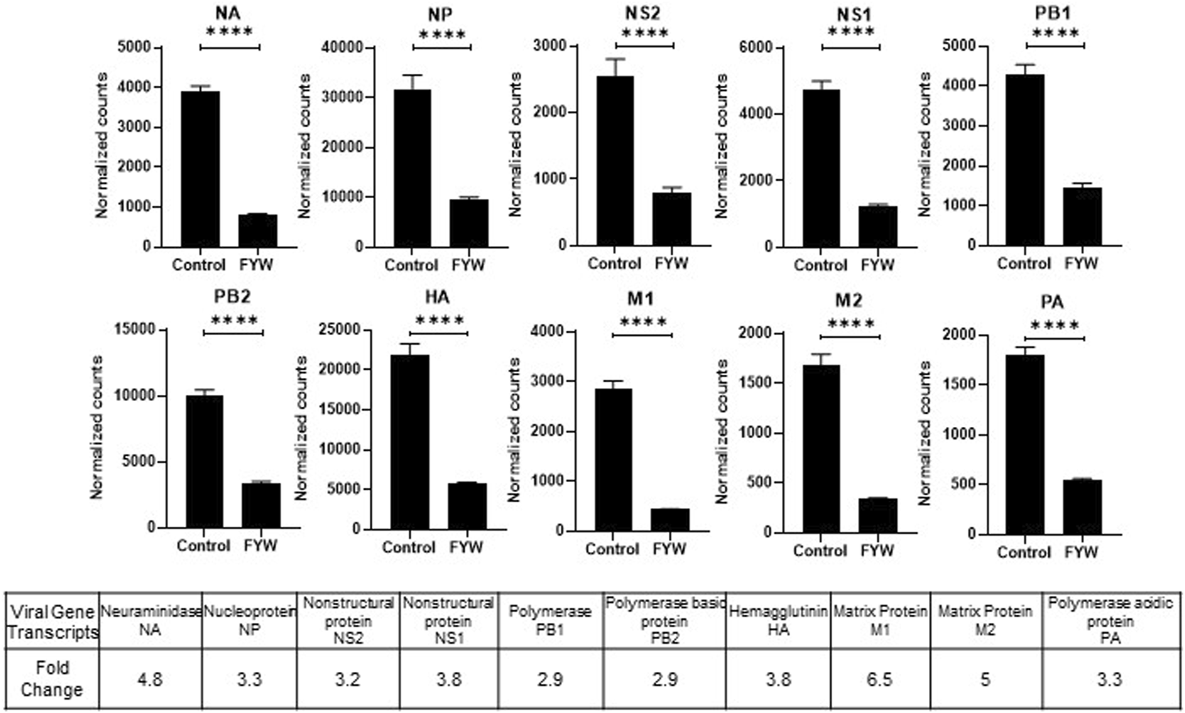 Treatment with FYW decreased IFN signaling and viral recovery across a number of cell types. To investigate this seemingly dichotomy further, we determined the transcriptional response to FYW treatment. A549 cells were first primed with FYW or control for 48 h and then exposed or not exposed to influenza (at an MOI of 1) for 24 h. RNA was isolated and analyzed by bulk RNA sequencing. We found reduced viral transcripts across the mapped influenza transcriptome, further verifying that FYW impacts viral replication (Figure 7). In regard to host transcripts, treatment with FYW with or without infection had the greatest number of differentially expressed genes (DEGs) in comparison to control. FYW treatment led to 1053 upregulated DEGs of which 541 were sustained upon infection and 810 unique to FYW pretreatment and infection (Figure 8A). Reactome analysis identified pathways pertaining to cellular responses to stimuli, particularly the endoplasmic reticulum stress and unfolded protein stress responses (Table 1). FYW treatment also revealed 2123 downregulated DEGs. Reactome analysis demonstrated that 25 pathways were downregulated (p < 0.01 and FDR <0.05) (Table 2) with IFN signaling and IFN α/β signaling as the most significant (p ≤ 1.1e-16 and FDR ≤ 3.43e-14).