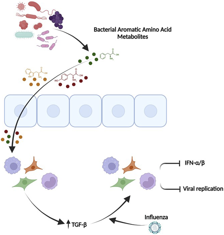 We hypothesized these single aromatic amino acid metabolites would have important cell type specific effects on innate immune signaling and host-pathogen outcomes. Our previous work identified that one of the tyrosine metabolites, 4-OH-phenylpropionic acid, protects from influenza through a type 1 IFN dependent mechanism (Steed et al., 2017). Given that these aromatic acid acids are metabolized by similar or same niche microbiota and concurrently produced, we also hypothesized that their effects may be synergistic and the impact of a composition of these metabolites is crucial to understand. Herein, we screened for metabolite-induced alterations in IFN signaling in human alveolar epithelial cells and monocytes and found that IFN signaling was most often suppressed by these metabolites in both cell types. Pooled treatment with amino acid metabolite families (F, Y, or W) or a combination of all these metabolites together (FYW) reduced IFN signaling in both cell types, albeit more so in epithelial cells than monocytes, and showed a dominant effect of tryptophan metabolites. Finally, we demonstrate that these metabolites alter IFN signaling through a TGF-beta dependent mechanism and improve host outcomes upon influenza challenge.