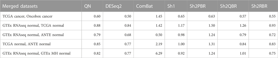 To compare performance, we did harmonization procedure by using the following alternative methods: (i) Quantile normalization, QN, a gold standard for normalization of the MH gene expression data (Bolstad et al., 2003); (ii) DESeq2, a gold standard for normalization of the RNAseq gene expression data (Love et al., 2014; Maza, 2016; Varet et al., 2016); (iii) ComBat, specially developed for batch effect elimination (Johnson et al., 2007; Lagani et al., 2016); (iv) Shambhala-1, uniformly shaped harmonization method with the XPN gene expression transformation module (Borisov et al., 2019), Sh1; (v) Shambhala-2 (Borisov et al., 2022), uniformly shaped harmonization method with CuBlock gene expression transformation module and P-based rescaling (Sh2PBR); (vi) Shambhala-2 with the Q-based rescaling (Sh2QBR); (vii) Shambhala-2 with the R-based rescaling (Sh2RBR).