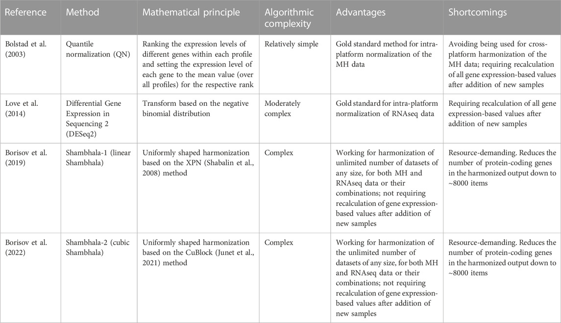 Many aspects of such intra- and cross-platform normalization of MH gene expression profiles were studied in the recent 2 decades. Namely, the approaches were formulated for studying the incomparability of profiles obtained using different platforms (Shi et al., 2006; Chen et al., 2007; Liang, 2007), for normalization of their expression data (Bolstad et al., 2003; Benito et al., 2004; Jiang et al., 2004; Warnat et al., 2005; Johnson et al., 2007; Marron et al., 2007; Martinez et al., 2008; Shabalin et al., 2008; Xia et al., 2009; Huang et al., 2012), and for assessing quality of their co-normalization (Shi et al., 2006; Chen et al., 2007; Liang, 2007; Rudy and Valafar, 2011; Deshwar and Morris, 2014). In turn, the routine next-generation sequencing (NGS) of mRNA (RNAseq) has largely replaced MH in many applications and became the gold standard for transcriptomic profiling (Nagalakshmi et al., 2008; Maher et al., 2009; Wang et al., 2009; Chu and Corey, 2012; Ingolia et al., 2012; Korir et al., 2015; Taylor et al., 2016).