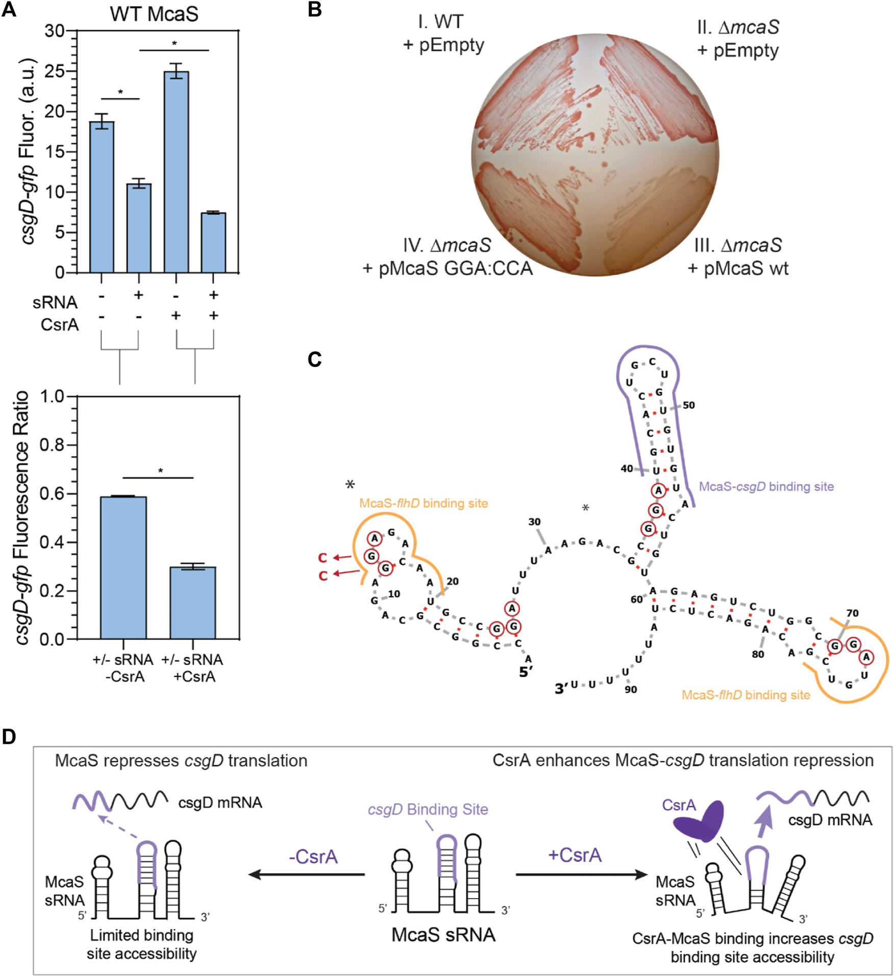 McaS-csgD repression is enhanced by direct CsrA interactions under native expression conditions. (A) Fluorescence of a csgD-gfp mRNA reporter in response to both the McaS sRNA and CsrA expression tested combinatorially. The fluorescence ratios of the csgD-gfp reporter between the presence and absence of McaS are calculated with and without CsrA expression. The csgD-gfp mRNA reporter was constructed similarly to the glgC-gfp mRNA reporter. (B) Effect of CsrA on McaS-csgD regulation evaluated by the Congo Red plate to measure endogenous curli expression. (Quadrant I) Wild type E. coli transformed with -an empty control version of a low expression plasmid (pEmpty), (II) ΔmcaS E. coli transformed with pEmpty (III) pMcaS wild type, and (IV) pMcaS mutant (5′-most GGA:CCA) were grown for 48 h with limited NaCl as to induce native curli expression. Plasmid-based induction of wild type McaS (1 mM IPTG) effectively repressed the csgD mRNA (white colonies) compared to wild type E. coli (dark red colonies), while mutant McaS (5′-most GGA:CCA) showed minor repression (light red colonies). (C) Predicted secondary structure of McaS (Vienna RNA) (Gruber et al., 2008; Lorenz et al., 2011), with GGA motifs (red-circled nts), mutations (blue arrows and nucleotides), and known csgD and flhD mRNA binding sites indicated (purple and yellow outlines, respectively). (D) Proposed effect of CsrA on McaS-csgD regulation: CsrA enhances repression by increasing mRNA-sRNA binding site accessibility.