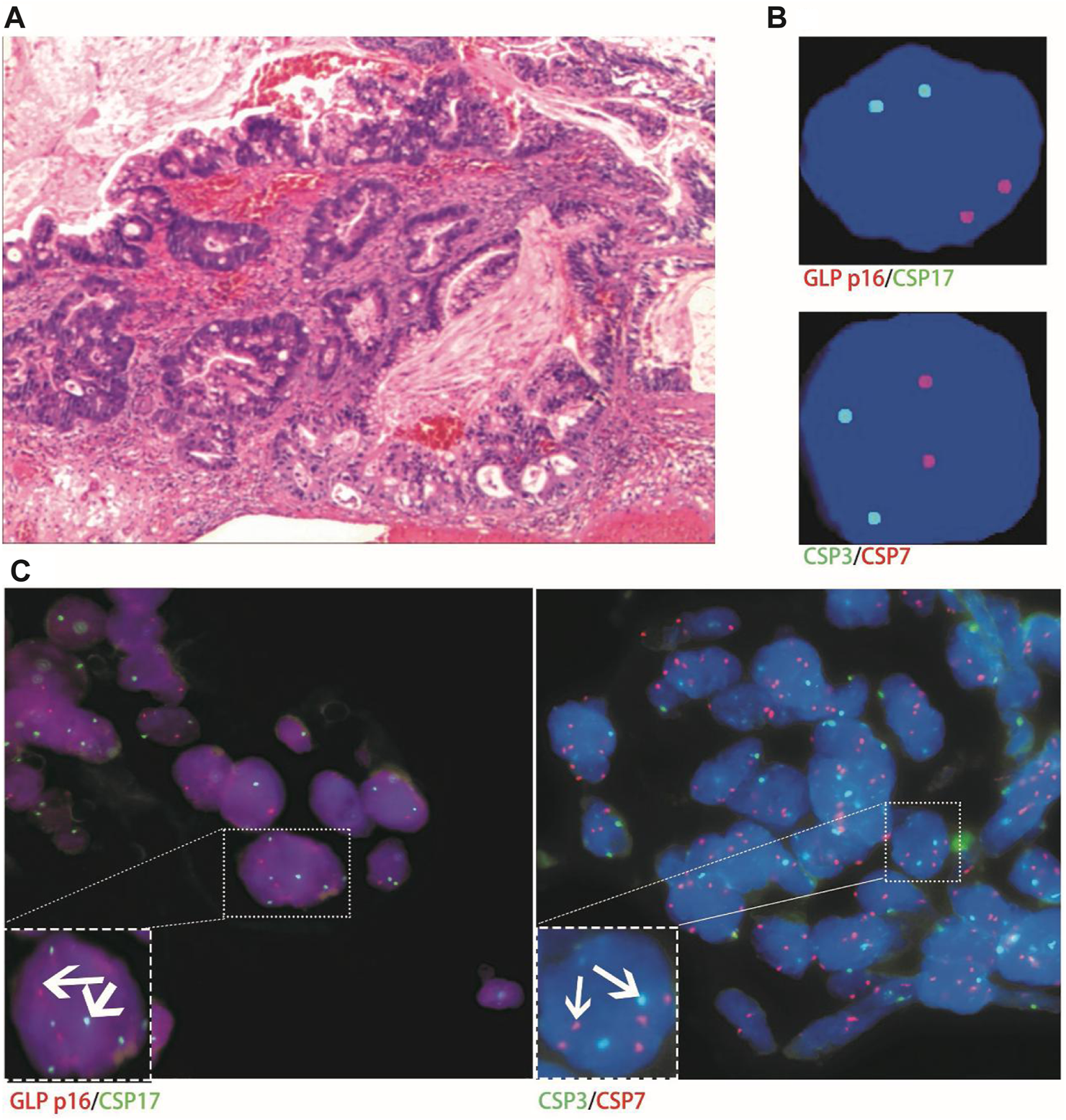 Case No.15. Positive validation of histological FISH and urine FISH in adenocarcinoma. (A) is the histopathological image of prostate cancer. Microscopy showed moderately and poorly differentiated with Gleason score 4 + 4 = 8(hematoxylin-eosin staining, ×200 magnification). (B) is the urine FISH result, showing the amplification of chromosomes 3, 7 and 17, and no GLP p16 gene deletion. (C) is histological FISH (×400 magnification), also showing amplification of chromosomes 3, 7 and 17, without GLP p16 gene deletion (indicated by arrows). The mean fluorescence signals of chromosome 3, 7, 17 and GLP p16 locus in each cell were 3.48, 3.94, 2.93 and 2.06, respectively. Red represents CSP7 and GLP p16. Green represents CSP3 and CSP17.