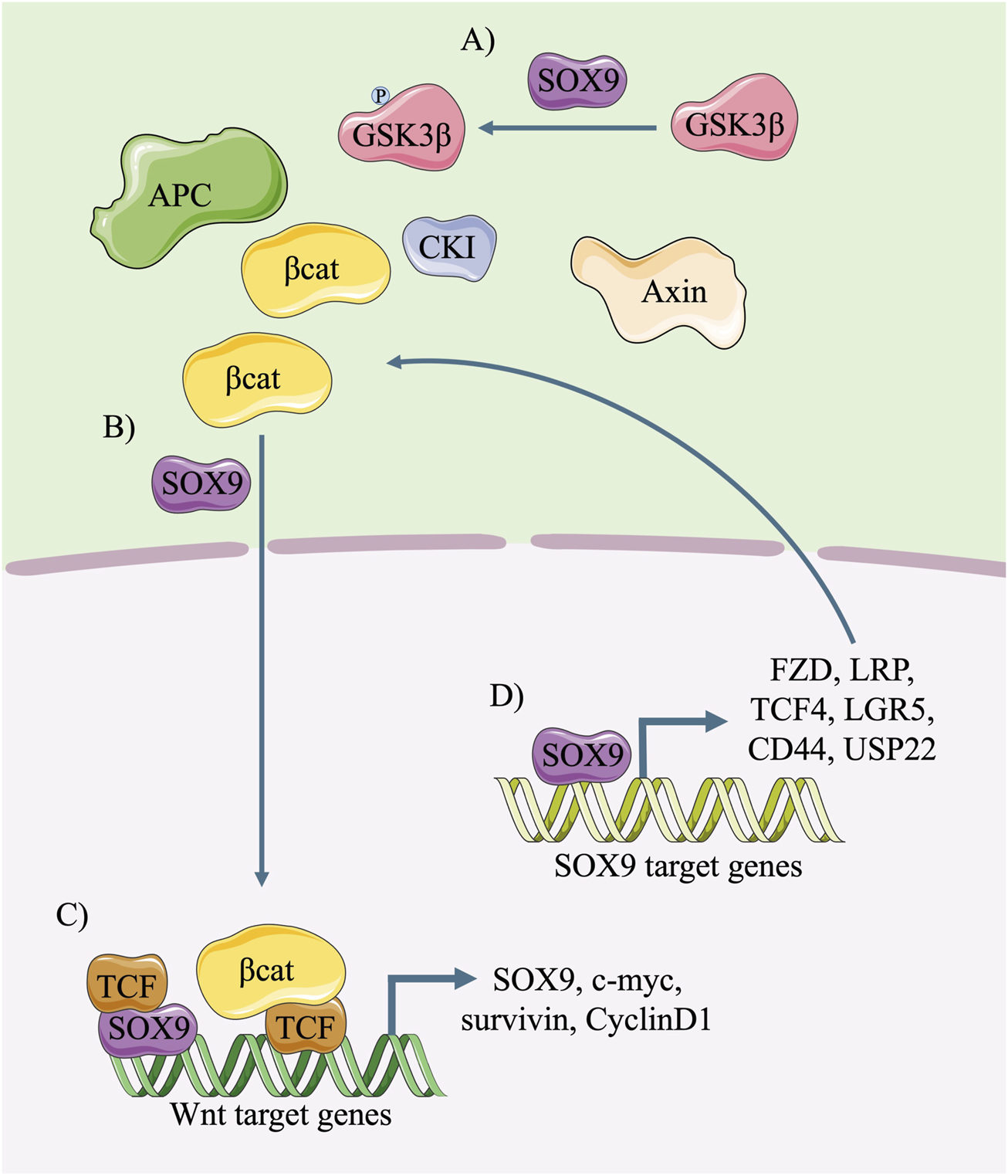 Diagram of mutual activation between SOX9 and the canonical Wnt pathway. In cytoplasm, SOX9 phosphorylates GSK3β, improves the stability of β-catenin (A) and promotes its nuclear translocation (B). In the nucleus, the binding of SOX9/TCF complex to Wnt-responsive enhancer promotes the transcription of downstream molecules including SOX9 (C). The transcription of Wnt signalling pathway components and amplifiers, such as FZD, LRP and TCF4, could be activated by SOX9 and further promotes the canonical Wnt/β-catenin signals (D).
