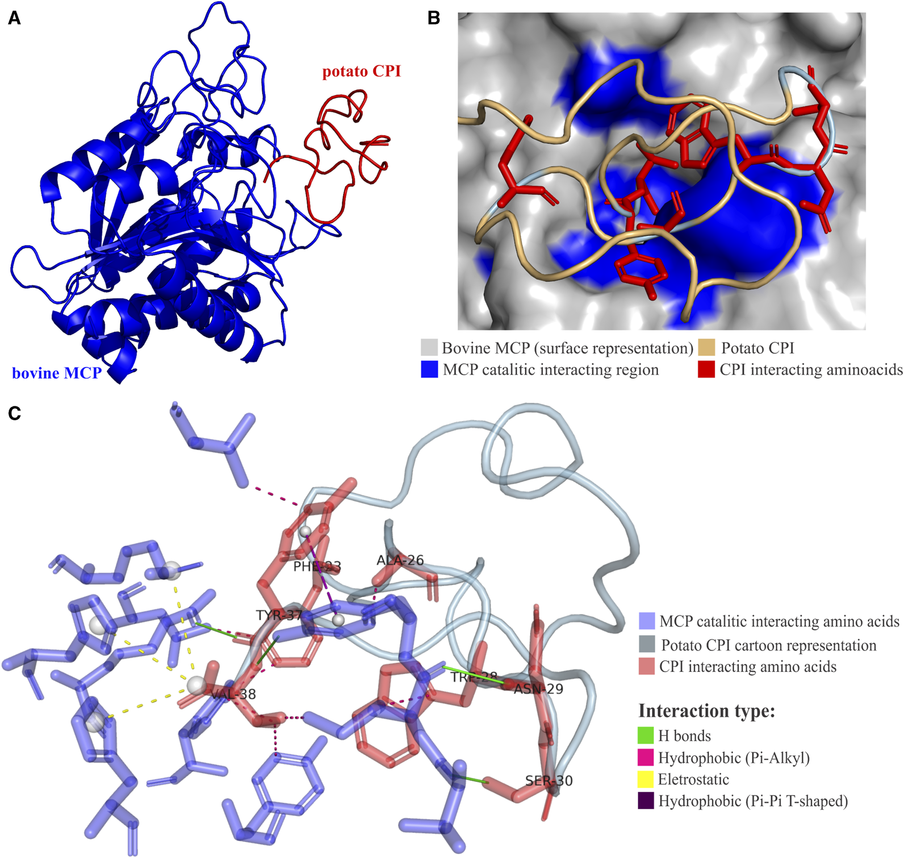 The secondary structure standards were predicted using PSIPRED (Buchan and Jones, 2019) software for all selected CPI sequences. PSIPRED employs a machine learning approach, utilizing feedforward neural networks, to predict secondary structure elements such as alpha helices, beta strands and coils, based on position-specific scoring matrices derived from multiple sequence alignments. The PDB structures of CPIs from potato (1H20 code) (González et al., 2003) and tomato (2HLG code) (Uribe et al., 2008) CPIs, determined by Nuclear Magnetic Resonance (NMR) technique, were used to exemplify the structural characteristics of plant CPIs. Furthermore, the PDB structure (4CPA code) of potato CPI interacting with a bovine (Bos taurus) metallocarboxypeptidase A (MCPA) (Rees and Lipscomb, 1982), determined by X-ray crystallography, was also used to show and exemplify the main features involved in plant CPIs mechanism of action. The bioinformatic programs PLIP (Adasme et al., 2021) and Dyscovery Studio 2021 (Biovia, 2021) were used to map interactions, considering factors like distance, polarity, and affinity between atoms and/or molecular groups. PLIP employs a combination of geometric and physicochemical criteria, along with sophisticated algorithms, to identify and categorize interactions between ligands and proteins, providing a detailed structural understanding of these interactions. Dyscovery Studio 2021 employs a suite of computational tools and algorithms to analyze molecular interactions, offering insights into binding affinities, thermodynamic parameters, and the energetic landscape of protein-ligand interactions.