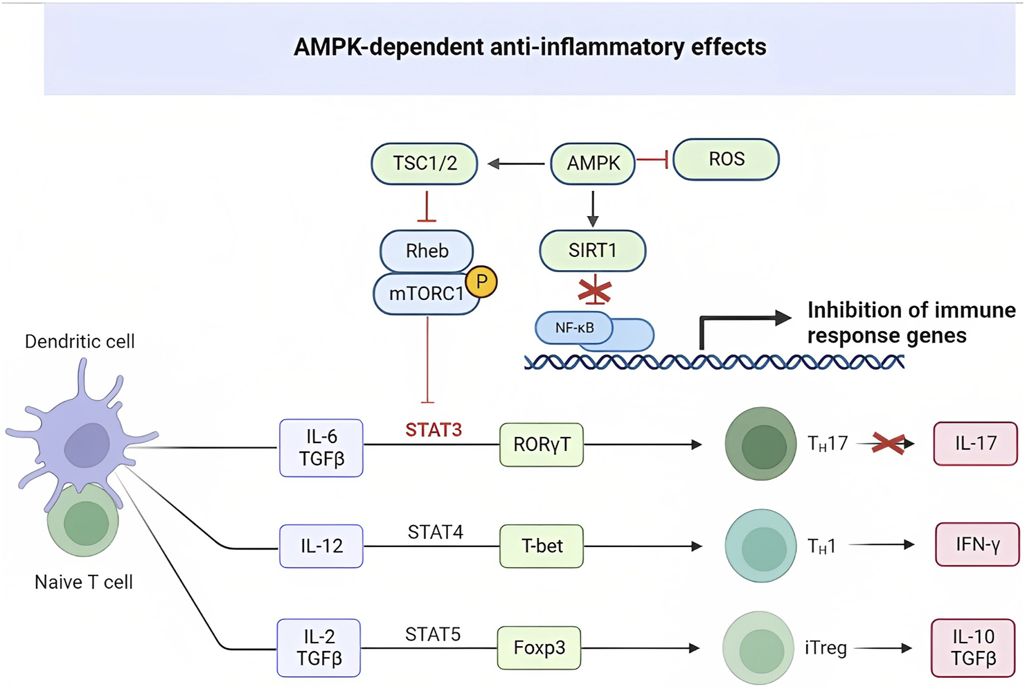 AMPK and mTOR serve as metabolic detectors that influence the balance between pro-inflammatory and anti-inflammatory cells. Th17 cells rely on glycolysis for their energy needs, while regulatory T cells (Tregs) rely on fatty acid oxidation. AMPK’s ability to regulate metabolism affects the differentiation of these cell types. On the other hand, mTOR activation, leading to the induction of HIF1α, promotes glucose import and glycolysis at the transcriptional and translational level. Lack of HIF1α induction significantly reduces Th17 cells. In a rat model of collagen-induced arthritis (CIA), metformin was found to activate AMPK, inhibit mTOR, and regulate the Th17/Treg ratio. Metformin also reduced the levels of proinflammatory cytokines TNFα, IL-1β, IL-6, and IL-17 in the serum of rats with CIA, while decreasing the number of splenic CD4+/RORγt+/IL-17 + T cells (Th17s) in a dose-dependent manner. Furthermore, metformin positively correlated with the increase of regulatory T cells (CD4+/CD25+/FOXP3+) in the study (Yang et al., 2017). Likewise, metformin played a role in alleviating autoimmune insulitis in a model of Type 1 diabetes (T1D) using NOD mice. Female NOD mice were administered metformin or a control substance starting at 4 weeks of age. By the time the mice reached 12 weeks of age, they showed signs of insulitis. However, the mice treated with metformin displayed a higher number of functional β cells compared to those on the control treatment. Additionally, metformin significantly reduced the number of pro-inflammatory IFN-γ+ and IL17+ CD4 T cells in the spleen of NOD mice, while concurrently increasing the presence of regulatory IL-10+ and Foxp3+ CD4-T cells. This effect resulted in the mitigation of autoimmune insulitis (Duan et al., 2019). The imbalance in Teff/Treg ratios observed in collagen-induced arthritis (CIA) and Type 1 diabetes (T1D) is also evident in various other diseases, including T2D, obesity, aging, and rheumatoid arthritis.