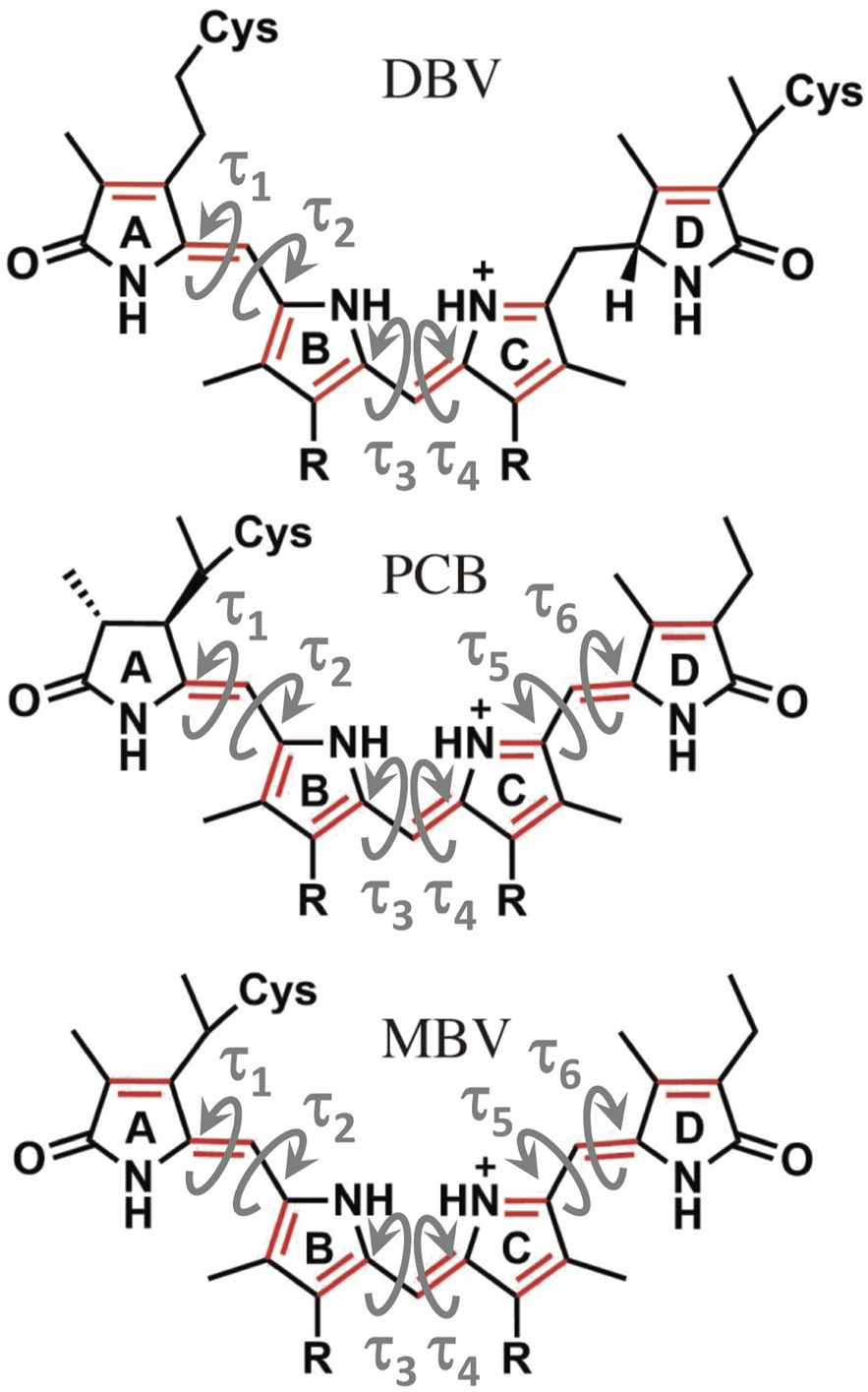 Structure of the linear tetrapyrrole arrangement of DBV, PCB and MBV bilin pigments indicating the key torsions that define the conformation of the conjugated region that characterizes the excited state.