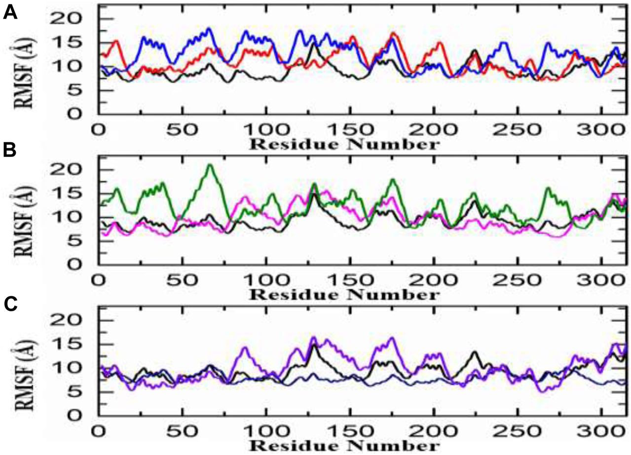 RMSf analysis of the finally selected hits (A) RMSf analysis Diamino-di nitro-methyl dioctyl phthalate/aldoreductase complex (red), Penta-O-galloyl glucose/aldoreductase complex (Blue) (B) Bisindolylmethane thiosemi-carbazides/aldoreductase complex (pink), Bisindolylmethane-hydrazone hybrids/Aldoreductase Complex (green) (C) ZINC35671852/Aldoreductase Complex (Purple), ZINC78774792/Aldoreductase Complex (Blue).