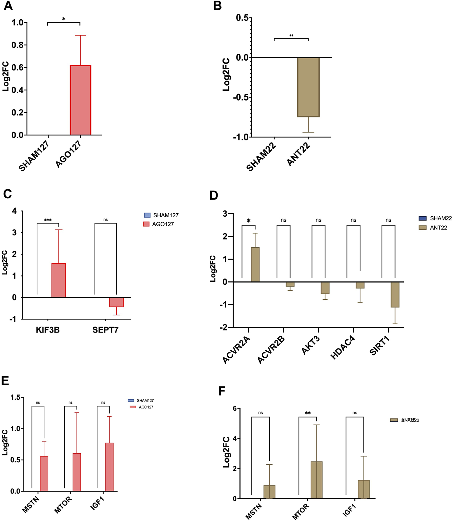 Total RNA was extracted from cell culture samples and muscle tissues from AGO127, ANT22, and SHAM injected regions using TRIzol reagent (Invitrogen, Thermo Fisher Scientific, Waltham, MA) according to the manufacturer’s instruction. The DNA-free kit (Ambion, Carlsbad, CA) was used according to the manufacturer to remove any genomic deoxyribonucleic acid (DNA) contamination from RNA samples. A NanoDrop1 spectrophotometer (Thermo Fisher) was used to quantify total RNA. RNA integrity numbers (RIN) were generated using an Agilent 4,200 TapeStation (Agilent Technologies, Santa Clara, CA), and all RIN values were above 9.5 for cells and above 7.0 for muscle tissues. Total RNA samples were stored at −80°C until further analysis.