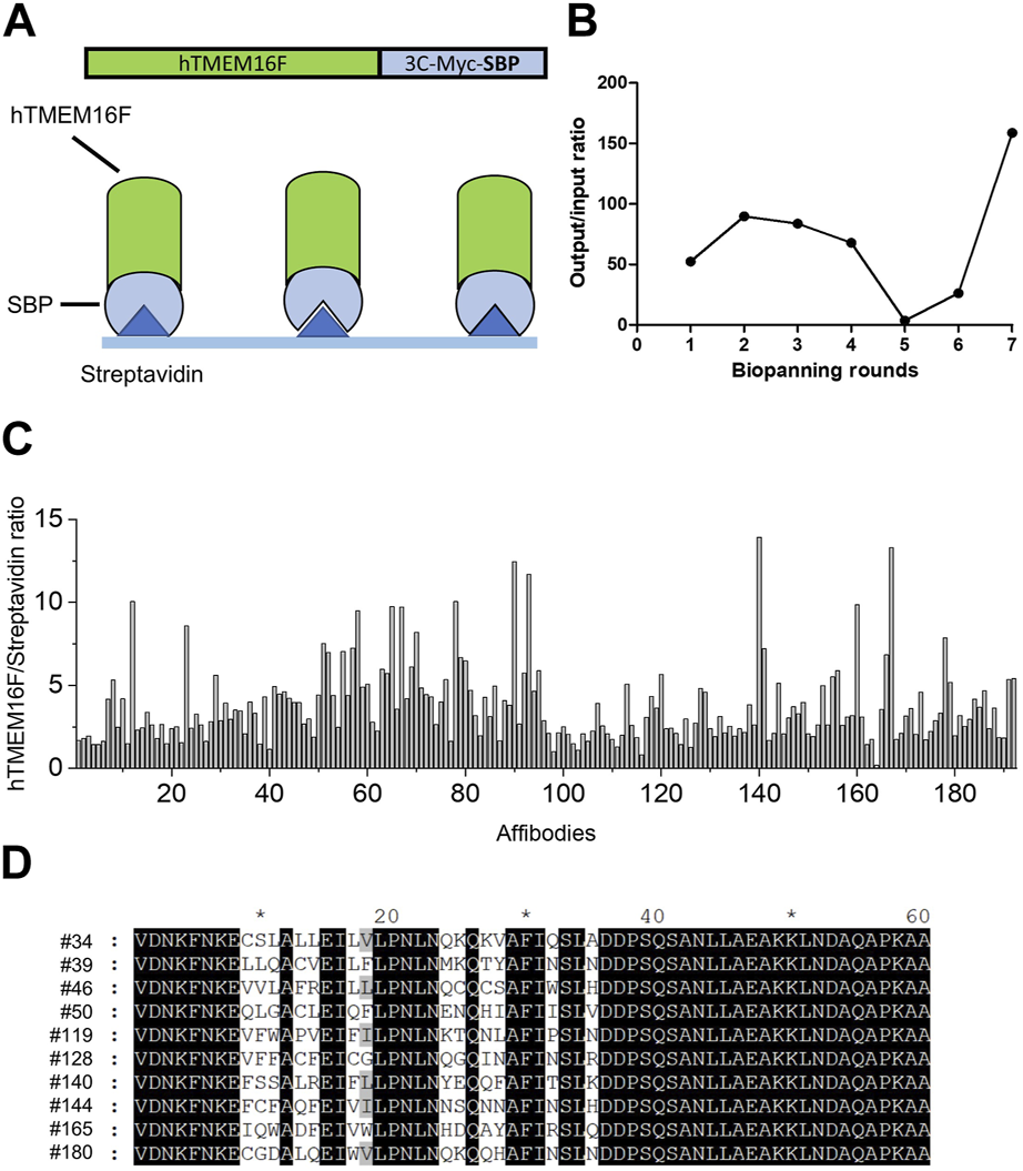 Screening for TMEM16F-specific affibodies using phage display (A) Schematic diagram of biopanning for TMEM16F-specific affibodies using streptavidin-coated plates. (B) Measurements of output/input phage ratios in all rounds of biopanning. (C) hTMEM16F/streptavidin ratios of the 192 candidate affibodies in ELISA from the seventh round of biopanning. (D) The amino acid sequences of the selected 10 affibodies.