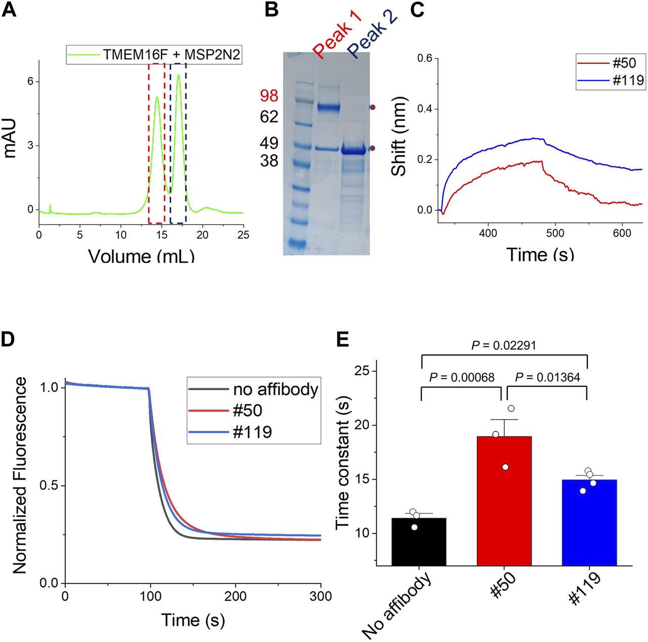 Binding of affibodies to TMEM16F in a lipid environment (A) and (B) Separation of the nanodisc complex containing TMEM16F from the empty nanodisc by FPLC under detergent-free conditions. The two peaks in the FPLC profile were confirmed by Coomassie blue staining of SDS-PAGE gels. (C) The association and dissociation profiles of #119 and #50 affibodies (10 μM) from the TMEM16F nanodisc immobilized on streptavidin (SA)-conjugated biosensor chips were investigated. (D) Functional effects of #50 and #119 affibodies on the TMEM16F in the liposomes. 20 μM of each affibody was applied in the assay. Scrambling activity was measured in the presence of 0.5 mM Ca2+. (E) The time constant of fluorescence decay from the scrambling assay was calculated by fitting the traces with single exponential function. Data are presented as mean ± SEM. One-way ANOVA analysis was performed and p-values between control (no affibody), #50 and #119 affibody treatment were calculated by Fisher’s test using Origin 2020 (OriginLab).