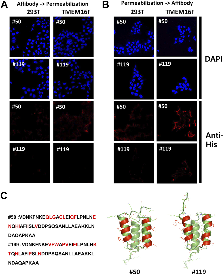 Binding capability of candidate affibodies to the TMEM16F in the cells (A) and (B) Immunofluorescence staining of 293T cells by using candidate affibodies. Non-transfected and TMEM16F expressing 293T cells were imaged. Affibodies were applicated to the cells before (A) and after (B) the membrane permeabilization. For the detection of affibodies, Alexa 555 conjugated anti-His antibody was treated. (C) Predicted structures of candidate affibodies. Structural prediction of affibody was performed using AlphaFold. The region could bind to the TMEM16F was indicated with red color in both sequences and the structures.