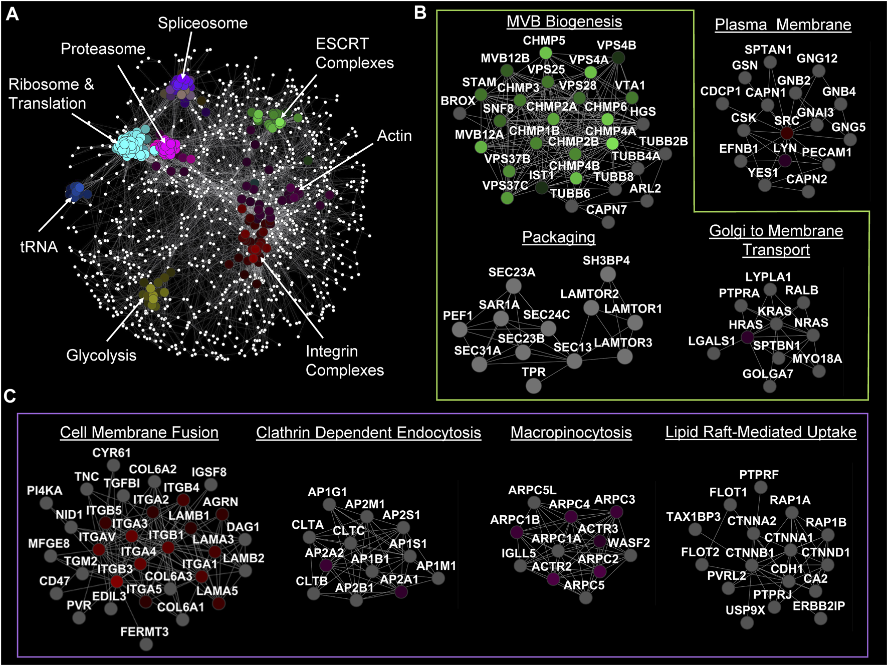 Network analysis of genes involved in EV biology. (A) SAFE analysis of genes that have appeared more than 73 times in articles (based on EVpedia). (B) Significant MCL sub-networks with crucial genes in EV biogenesis annotated. (C) Significant MCL sub-networks involved in EV uptake by different mechanisms.