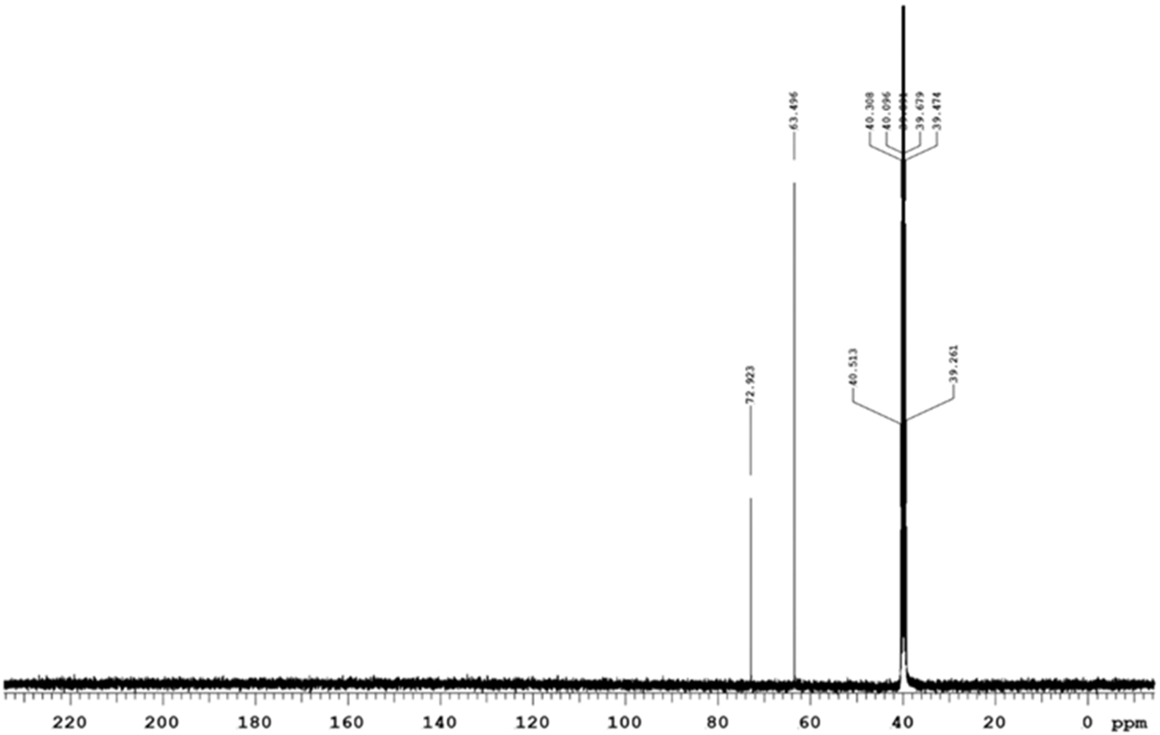 The 1H NMR spectrum of the PEG-AuNP-Antibody complex depicted in Figure 4, showed evidence of conjugation (coordination) between AuNP and the PEG-thio-amine and antibody. This was seen as the absence of the triplet typically observed in the 1H NMR spectra for PEG-Thio-amine. Furthermore, broadening of the multiplets in the range of 3.24–3.48, along with a slight shift (0.22 ppm) towards the upfiled was observed for the protons on the alkoxy carbons within the repeating units of the molecule. In the 13C NMR spectrum (Figure 5), there were no peaks observed due to C-S bond between 20-21 ppm. The change in chemical shift and the broadening of the peaks can be attributed to the proximity of the nanoparticle surface in which it forms Au-S bond with gold thereby eliminating the sulfide hydrogen. Likewise, on the protons of the alkoxy carbons, a chemical shift upfield at 63.49 ppm was observed for the alkoxy carbons of the PEG-thio-amine molecule attached to the AuNP. Additionally, an extra carbon peak was discernible at 72.93 ppm in the 13C NMR indicative of the presence of an extra molecule (antibody) in the complex.