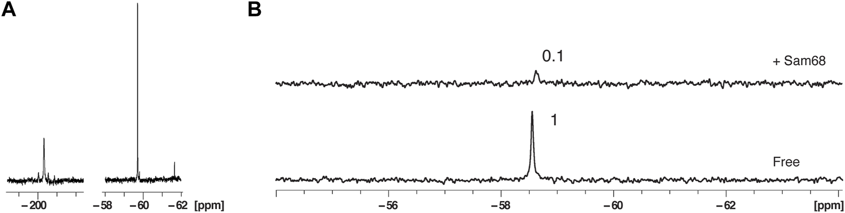 We therefore synthesized a 2′-OCF3 adenosine phosphoramidite (for details, see Supplementary Material S1) and incorporated it at position 20 of the ssRNA: UUACAGGGUUUUAGACAAA-(2′-OCF3-A)U (RNA3). To confirm that the 2′-OCF3 modification does not significantly interfere with the binding of RBPs, we tested the binding of Sam68 with the unmodified and 2′-OCF3-modified RNA using electromobility shift assay (EMSA) (Supplementary Figure S5). While the binding of Sam68 to the 2′-OCF3 RNA appears to be weaker than with the unmodified RNA, probably due to the bulkiness of the 2′-OCF3 compared to 2′-F, the binding still occurs at the concentrations used for the NMR studies (200 μM of protein).