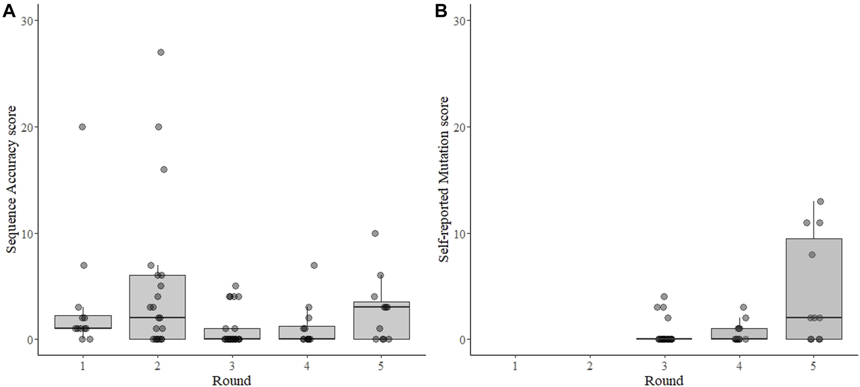 Sequence accuracy scores for SARS-CoV-2 sequencing EQAs (A) and scoring for self-reported mutation in the spike gene (B). Each point represents the result from each sample submitted by each participant for each of five rounds of EQAs with boxes around the interquartile range and a thick horizontal line indicating the median value. The sequence accuracy score (A) is the number of differences from the consensus sequence of all laboratories for each sample. The accuracy score was independently verified for the 3rd, 4th, and 5th rounds, but were inferred from submitted mutations for the 1st and 2nd rounds as no fastn files were requested during those two rounds. The self-reported mutation score (B) is a count of the differences between the non-synonymous amino acid mutations in the spike protein reported by the participant and an independent analysis of the mutations by the evaluator, which was calculated for the 3rd, 4th, and 5th rounds. In both panels the points are transparent gray and appear darker when overlapping.