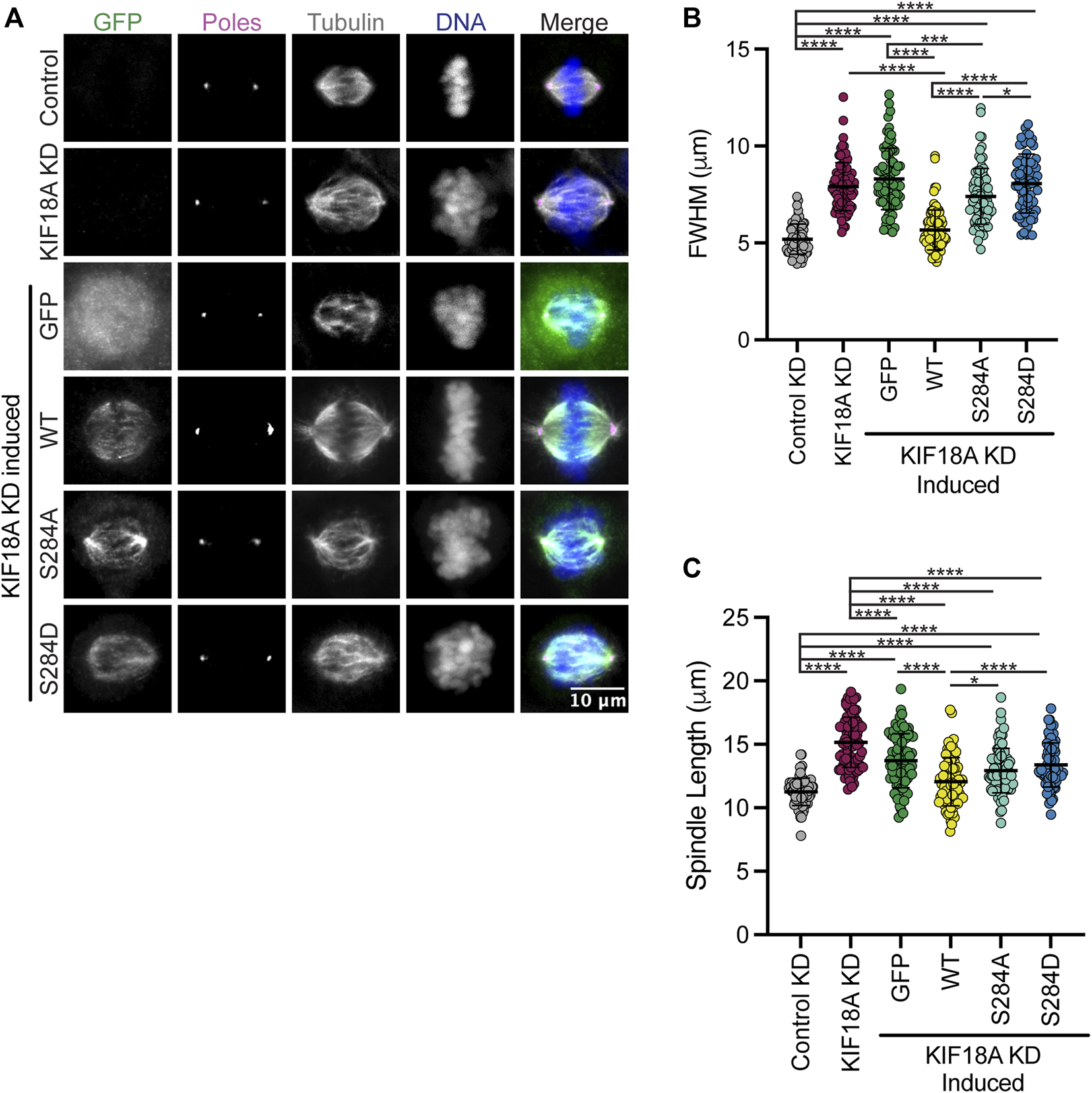 Expression of KIF18A S284 does not rescue KIF18A knockdown phenotypes. (A) Immunofluorescence images of HeLa Kyoto GFP KIF18A inducible cells fixed and stained 24 h after endogenous KIF18A knockdown and induction of the GFP KIF18A construct. Scale bar: 10 μm. Colors indicate pseudo color in a merged image. From left to right, GFP antibody staining, poles/γ-tubulin antibody staining, α-tubulin antibody staining, DNA/DAPI, and merged image. (B) Plot of full-width at half maximum values measured for chromosome distributions in HeLa Kyoto GFP KIF18A inducible cells. The solid horizontal line indicates mean, and vertical lines indicate standard deviation. Each dot represents a single cell. Data acquired from three experimental replicates. One-way ANOVA with Tukey’s test for multiple comparisons was run, p-value: <0.05 (*), <0.01 (**), <0.001 (***), and <0.0001 (****). If no significance is indicated, differences were not significant (>0.05). (C) Quantification of spindle length in HeLa Kyoto GFP KIF18A inducible cells. The solid horizontal line indicates mean, and vertical lines indicate standard deviation. Each dot represents a single cell. The following cell numbers were analyzed for each condition in (B,C) control siRNA = 75, KIF18A siRNA = 84, GFP = 80, GFP-KIF18A WT = 81, GFP-S284A = 83, and GFP-S284D = 78. Data acquired from three experimental replicates. One-way ANOVA with Tukey’s test for multiple comparisons was run. p-value style: <0.05 (*), <0.01 (**), <0.001 (***), and <0.0001 (****). If no significance is indicated, the result was not significant (>0.05).