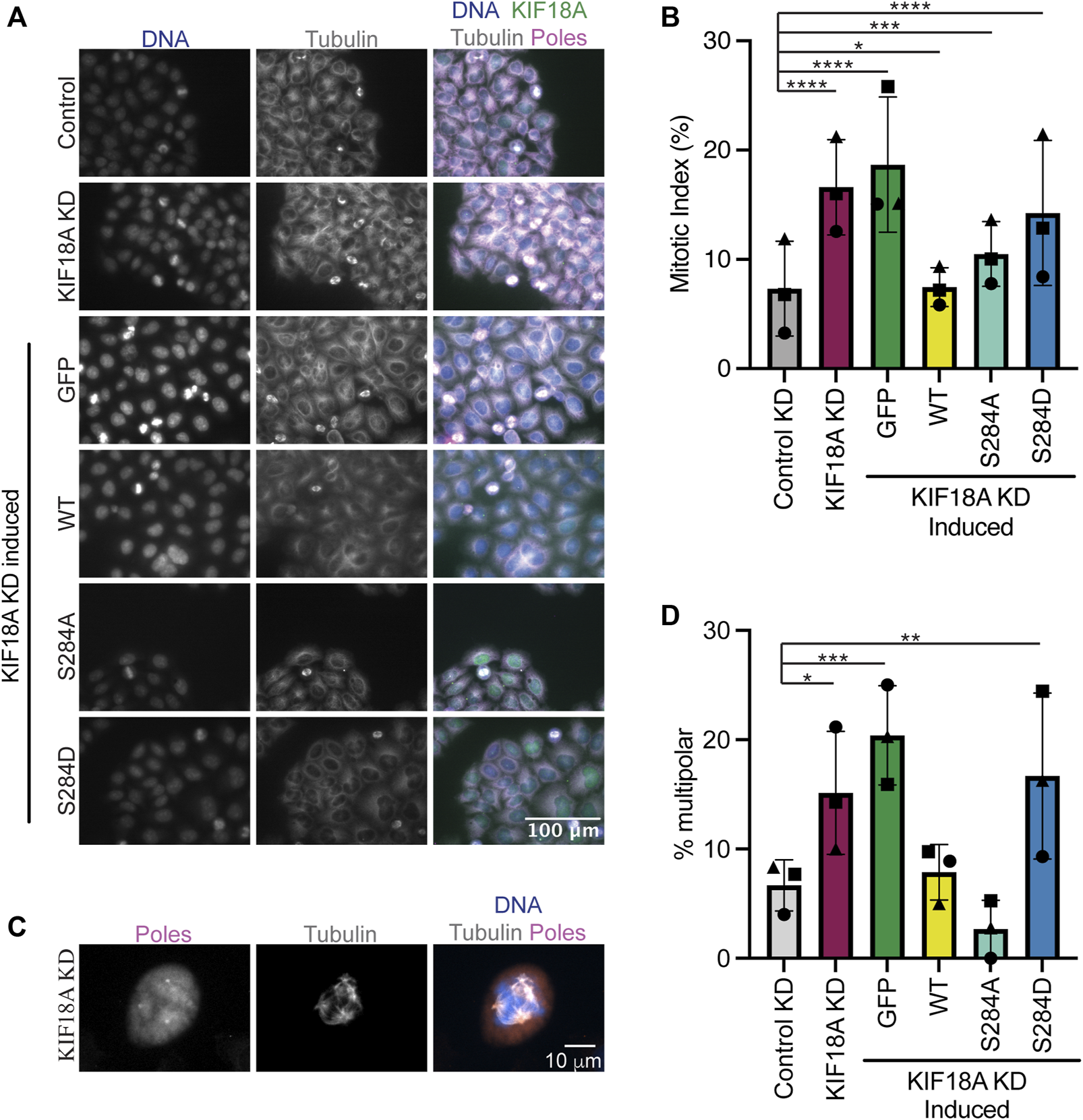 Mutation of KIF18A S284 to S284D leads to mitotic arrest and multipolar spindles. (A) Immunofluorescence images of HeLa Kyoto GFP KIF18A inducible cells fixed and stained 24 h after endogenous KIF18A knockdown and induction of the GFP KIF18A construct. Scale bar: 100 μm. Colors indicate pseudo color in a merged image. From left to right, DNA/DAPI, α-tubulin antibody staining, and merged image. The merged image includes KIF18A and spindle pole antibody staining in addition to DNA and α-tubulin antibody staining. (B) Quantification of the mitotic index (% cells in mitosis) in HeLa Kyoto GFP KIF18A inducible cell lines. (C) Representative image of a multipolar spindle in a KIF18A KD cell. (D) Quantification of multipolarity (% multipolar cells) in HeLa Kyoto GFP KIF18A inducible cell lines. Bars in (B,D) indicate overall mean, the circles indicate mean from experimental replicate 1, the squares indicate mean from experimental replicate 2, and the triangles indicate the mean from experimental replicate 3. Total number of cells analyzed for HeLa Kyoto: KIF18A KD = 1402, GFP = 997, GFP-KIF18A WT = 2136, GFP-S284A = 1364, and GFP-S284D = 1574. Data were compared using a chi-squared test. p-value style: <0.05 (*), <0.01 (**), <0.001 (***), and <0.0001 (****). If no significance is indicated, the result was not significant (>0.05).