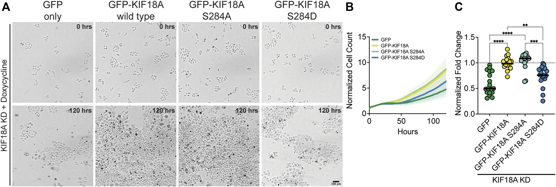 MDA-MB-231, HT-29, or RPE1 cells were seeded into 24-well plates (Falcon, 353047) and allowed to adhere overnight before adding the indicated concentrations of Compound 3 or Sovilnesib. Approximately 6 h after compound addition, plates were transferred to the Cytation 5 Cell Imaging Multimode Reader (BioTek/Agilent) driven by Gen5 software (BioTek/Agilent). Plates were then imaged every 2 h using a 4x Plan Fluorite 0.13 NA objective (Olympus) until confluency. Gen5 software was used to process images and measure cell counts at each timepoint using high-contrast brightfield imaging. Parameters used to determine the cell count (cell size and light-intensity thresholds) were optimized for each cell line and previously validated (Marquis et al., 2021). To determine the normalized fold-change, the number of cells at the final timepoint was divided by the number of cells in the first timepoint and normalized to control treatment (DMSO) for each experiment. Data were generated from a minimum of three individual replicates. Proliferation assays for HeLa Kyoto cell lines were performed in a similar manner. HeLa Kyoto cells inducibly expressing GFP, GFP-KIF18A wild type, GFP-KIF18A S284A, or GFP-KIF18A S284D were seeded into 24-well plates (Falcon, 353047) and allowed to adhere overnight. Knockdown of endogenous KIF18A was performed by adding 5 pmol KIF18A siRNA to each well. Simultaneously, the expression of GFP or GFP-KIF18A constructs was induced by addition of 2 μg/mL doxycycline (Thermo Fisher Scientific, BP26531). To determine the normalized fold-change, the number of cells at the final timepoint was divided by the number of cells at the first timepoint and normalized to GFP-KIF18A wild-type for each experiment. Data were generated from minimum three individual replicates.