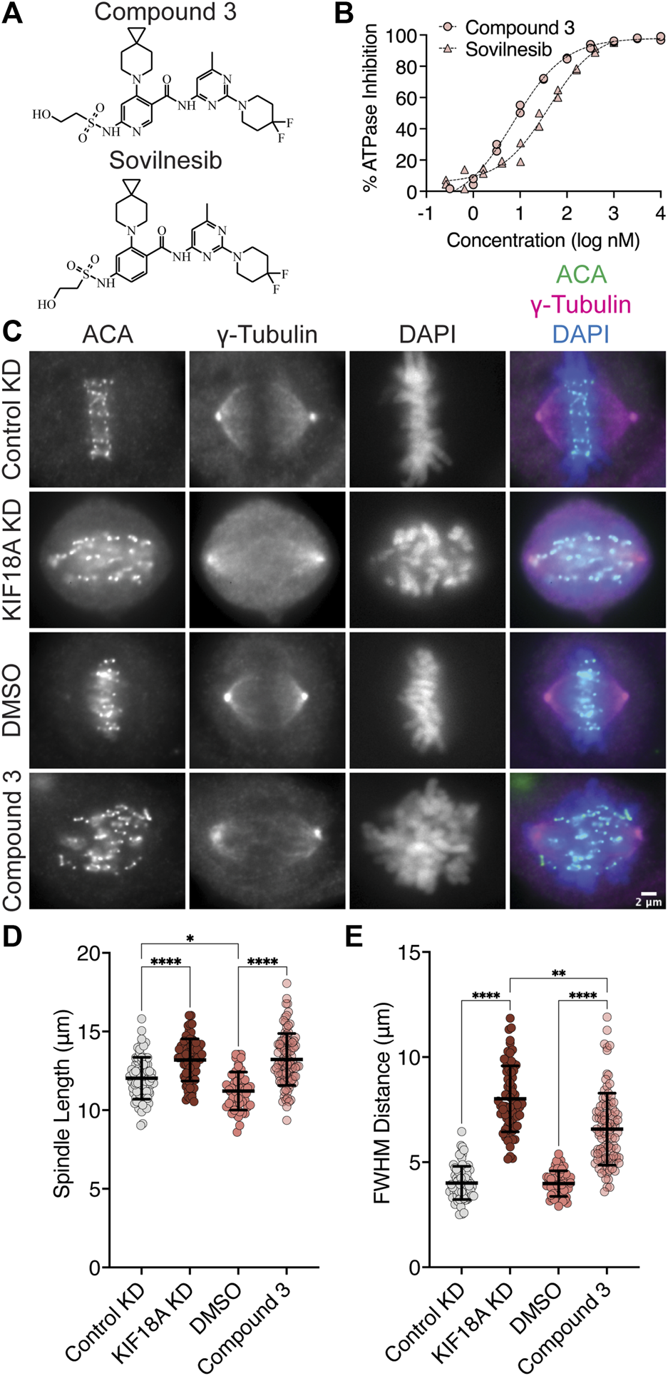 KIF18A inhibitors mimic KIF18A knockdown phenotypes in MDA-MB-231 cells. (A) Chemical structure of Compound 3. (B) % inhibition of KIF18A microtubule stimulated ATPase activity in vitro versus logarithmic concentration of the indicated KIF18A inhibitors. Representative data from two experimental replicates of each is shown. Dashed lines indicate non-linear fit of the data. (C) Immunofluorescence images of MDA-MB-231 cells fixed and stained after 24 h of indicated treatments. Scale bar: 2 μm. (D) Graph of spindle lengths measured in cells fixed and stained 24 h after the indicated treatments. (E) Graph of full-width at half maximum of centromere fluorescence distribution along the length of the spindle measured in cells fixed and stained 24 h after the indicated treatments. For (D–E), each dot represents a single cell. Mean ± standard deviation is displayed. Statistical results are shown for a Kruskal–Wallis with Dunn’s multiple comparisons test. p-value style: <0.05 (*), <0.01 (**), <0.001 (***), and <0.0001 (****). n.s. indicates not significant (>0.05). The following cell numbers were analyzed: Control siRNA = 76, KIF18A siRNA = 69, DMSO = 51, and Compound 3 = 96.