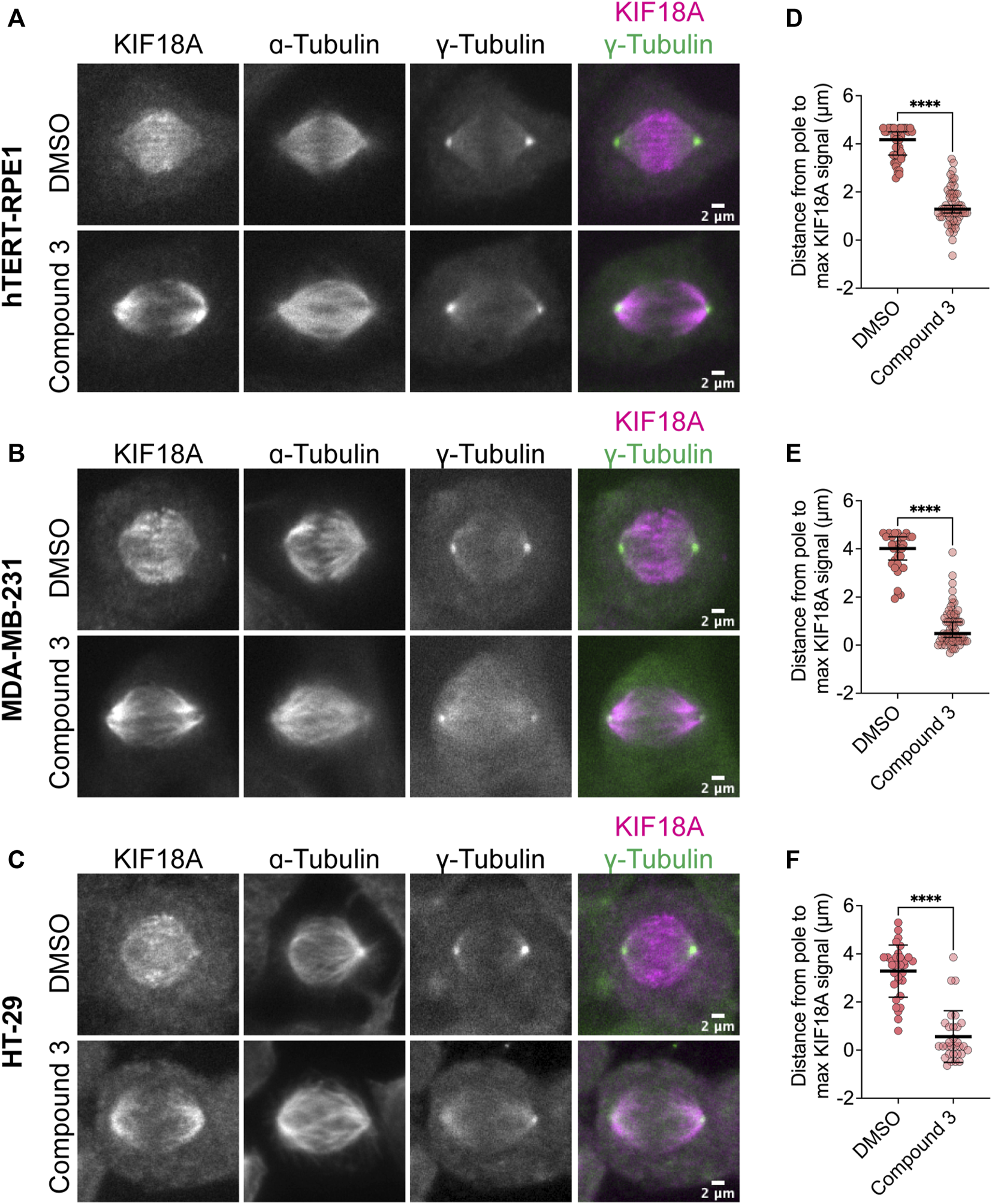 RPE1, MDA-MB-231, and HT-29 cells were treated with either DMSO Compound 3 (250 nM), or Sovilnesib (250 nM) for 24 h and then fixed for immunofluorescence. The following primary antibodies were used at the indicated dilutions: rat anti-α-tubulin 1:500 (Sigma-Aldrich, MAB 1864), rabbit anti-KIF18A 1:100 (Bethyl, A301-080A), and mouse anti-γ-tubulin 1:500 (Sigma-Aldrich, T5326). Single-focal plane images containing the γ-tubulin pole signal were acquired for individual cells. To measure KIF18A localization relative to the spindle pole, a 10-pixel wide line was manually drawn in Fiji from an individual γ-tubulin pole signal toward the center of the spindle. The profile intensities of KIF18A, α-tubulin, and γ-tubulin along that line were measured and recorded using the plotProfile command in ImageJ/Fiji. Each of these profile intensities was normalized internally to its highest value. These normalized line scans were then aligned by peak γ-tubulin intensity and averaged for each pixel distance. The distance from the pole to the maximum KIF18A signal was determined for each aligned line scan. Mean and standard deviations are reported from a minimum of three independent experiments for each construct.