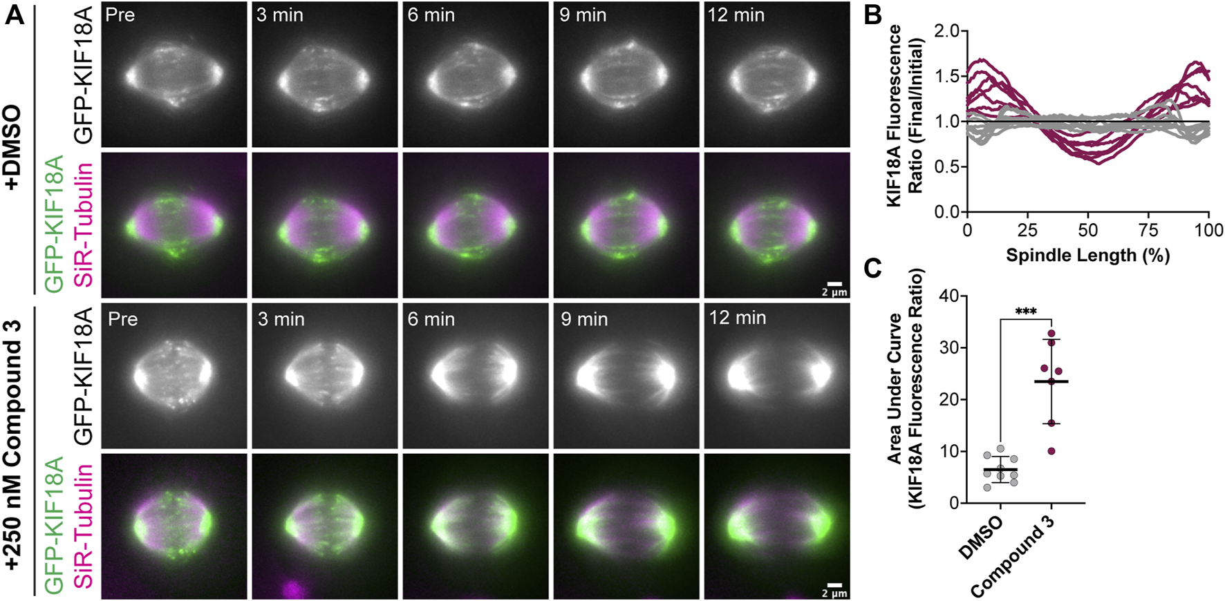 RPE1 cells inducibly expressing siRNA-resistant GFP-KIF18A were seeded into glass-bottom 24-well dishes (Cellvis, P24-1.5h-N). Cells were treated with 2 μg/mL doxycycline (Thermo Fisher Scientific, BP26531) to induce the expression of GFP-KIF18A and 5 pmol KIF18A siRNA to deplete endogenous KIF18A. Approximately 1–1.5 h before imaging, cells were transferred into CO2-independent media (Gibco, 18045088) supplemented with 10% FBS and containing 100 nM SiR-tubulin (Spirochrome, SC002), SPY595-DNA (1:10,000) (Spirochrome, SC301), 10 μM verapamil (Spirochrome, SCV01), and 20 μM MG-132 (Selleck Chemicals, S2619). Images were acquired at 30-s intervals using a Nikon 60x 1.4 NA objective with 1 μm z-sections for 4–7 μm total (5–8 frames). To quantify changes in KIF18A fluorescence, a rectangular ROI encompassing the spindle was drawn and the KIF18A fluorescence within that ROI was measured and recorded using the plotProfile command in ImageJ. The KIF18A fluorescence profile was measured for a timepoint before DMSO or Compound 3 addition (Initial: −1:30 min before DMSO or Compound 3 addition) and after DMSO or Compound 3 addition (Final: 12 min after DMSO or Compound 3 addition). Spindle lengths were normalized on a 0%–100% scale to account for differences in spindle lengths between cells. The ratio of Final to Initial KIF18A fluorescence was determined by dividing the KIF18A fluorescence values from the final timepoint by the initial timepoint for each individual cell. This ratio was then plotted as a function of % spindle length for each individual cell. To quantify the magnitude of the differences between the Final and Initial KIF18A fluorescence curves, the “Area under the Curve” calculation in GraphPad Prism was used.
