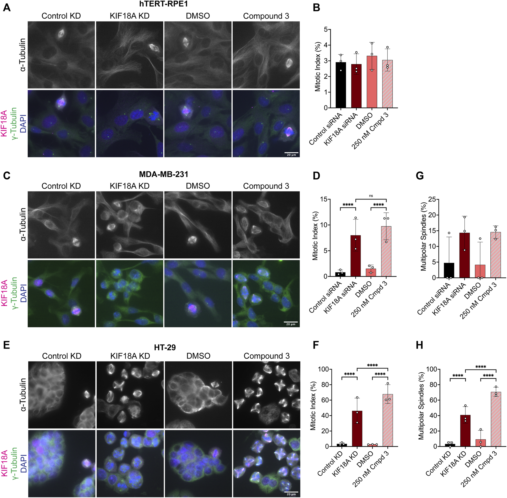 In a 24-well plate format, MDA-MB-231, HT-29, RPE1, or HeLa Kyoto cells were treated with control siRNA (5 pmol), KIF18A siRNA (5 pmol), DMSO, or Compound 3 (250 nM final concentration). After 24 h, the coverslips were fixed for staining using 1% paraformaldehyde (Electron Microscopy Sciences, 15710) in −20°C methanol. Cells treated with control siRNA, KIF18A siRNA, DMSO, or 250 nM Compound 3 were fixed and stained for mouse anti-γ-tubulin 1:500 (Sigma-Aldrich, T5326), rabbit anti-KIF18A 1:100 (Bethyl, A301-080A), and rat anti-α-tubulin 1:500 (Sigma-Aldrich, MAB 1864). All primary antibodies were incubated for 1 h at room temperature. Twenty random fields of view were acquired for each condition, and the number of mitotic cells and total cells was counted in each field of view. For multipolar counts, the number of poles was determined for each mitotic cell by comparing both the α-tubulin and γ-tubulin channels. Mean and standard deviations are reported from minimum three individual biological replicates for each condition.