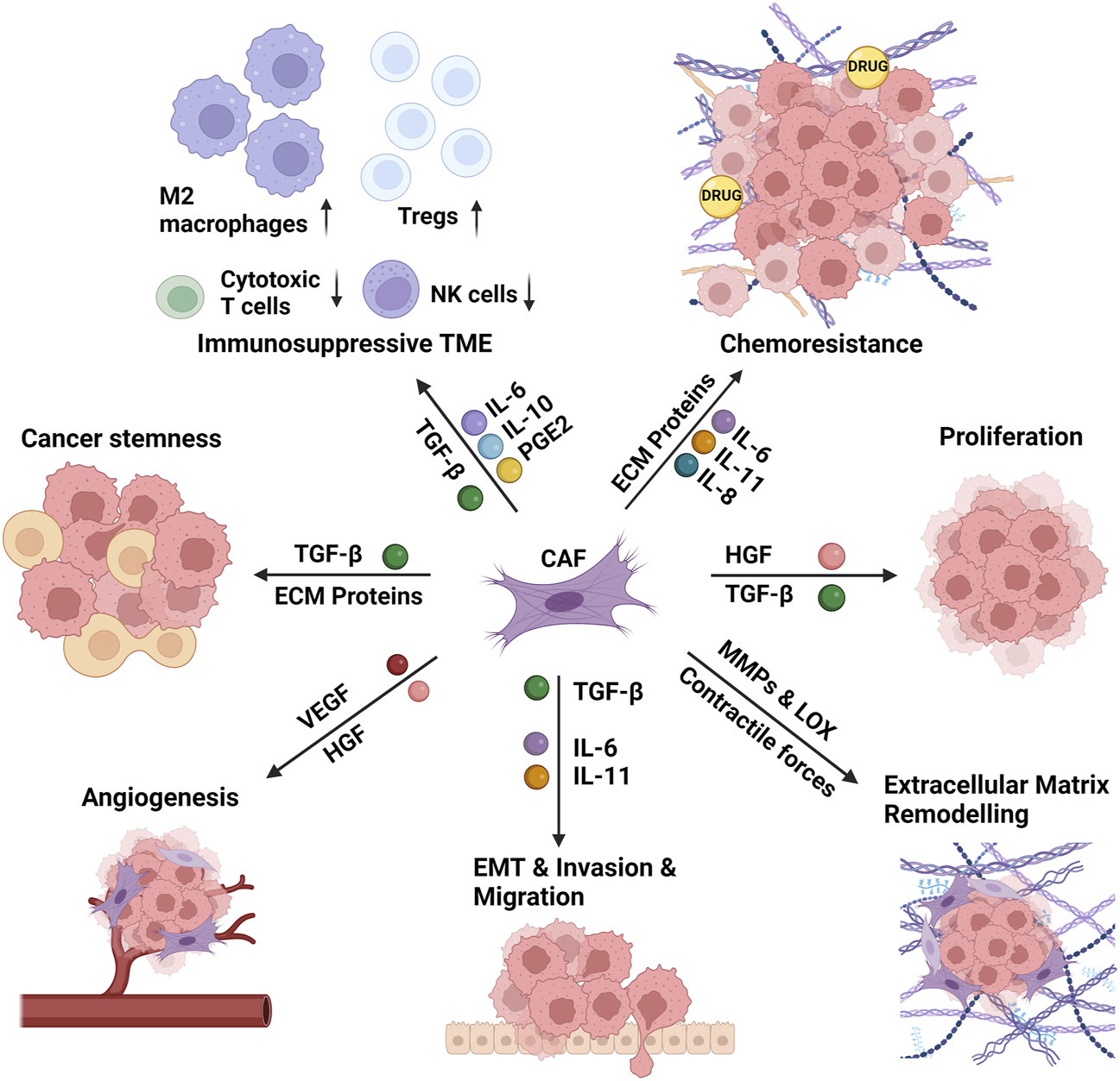 The functions of the cancer-associated fibroblasts in the tumor microenvironment. The cancer-associated fibroblasts (CAFs) induce the proliferation and stemness of cancer cells, remodel the extracellular matrix (ECM), and promote epithelial-mesenchymal transition (EMT) and invasion of surrounding tissues. CAF-induced matrix stiffness leads to chemoresistance via preventing the diffusion of anti-cancer drugs to the tumor tissue. CAFs also lead to an immunosuppressive microenvironment via increasing the recruitment and activity of M2 macrophages and regulatory T cells (Tregs) and decreasing the recruitment and activity of cytotoxic T cells and natural killer (NK) cells. CAFs perform these functions via secretion of several interleukins (IL-6, IL-8, IL-10, IL-11), growth factors (TGF-β: transforming growth factor- β, HGF: hepatocyte growth factor, VEGF: vascular endothelial growth factor), ECM proteins and ECM remodeling enzymes (MMPs: matrix metalloproteinases, LOX: lysyl oxidase), and several other mediators (e.g., PGE2: prostaglandin E2) and chemokines. Created with BioRender.com.