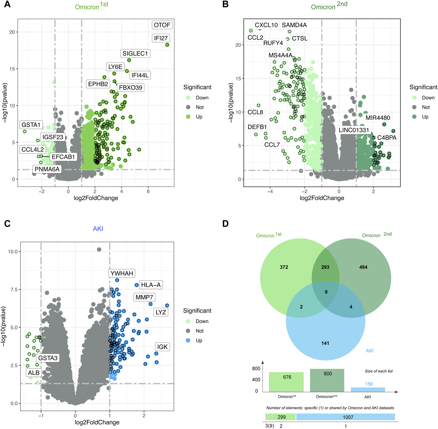 Volcano plots representing the gene expression patterns in primary and secondary Omicron infections (A, B) as well as AKI (C). Additionally, the Venn diagram (D) showcases the shared differentially expressed genes (DEGs) among AKI, primary Omicron infection, and secondary Omicron infection.
