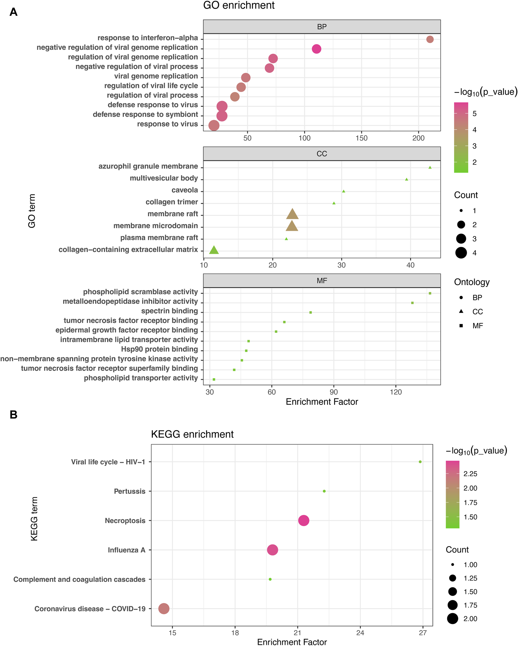 The GO enrichment approach is a widely employed method to elucidate associations between genes and GO terms, while the KEGG enrichment approach enables the identification of gene-pathway associations. To accomplish this, we employed the “clusterProfiler” package to perform a functional enrichment test on the shared DEGs. The GO database served as an annotation source for the GO analysis, encompassing three categories: biological processes, cellular components, and molecular functions. Our findings demonstrated significant enrichment of DEGs in response to interferon-alpha in the biological process category, azurophil granule membrane in the cellular component category, and phospholipid scramblase activity in the molecular function category (Figure 3A). Furthermore, our KEGG results unveiled the top six pathways associated with the shared DEGs, including Viral life cycle-HIV-1, Pertussis, Necroptosis, Influenza A, Complement and coagulation cascades, and COVID-19 (Figure 3B).