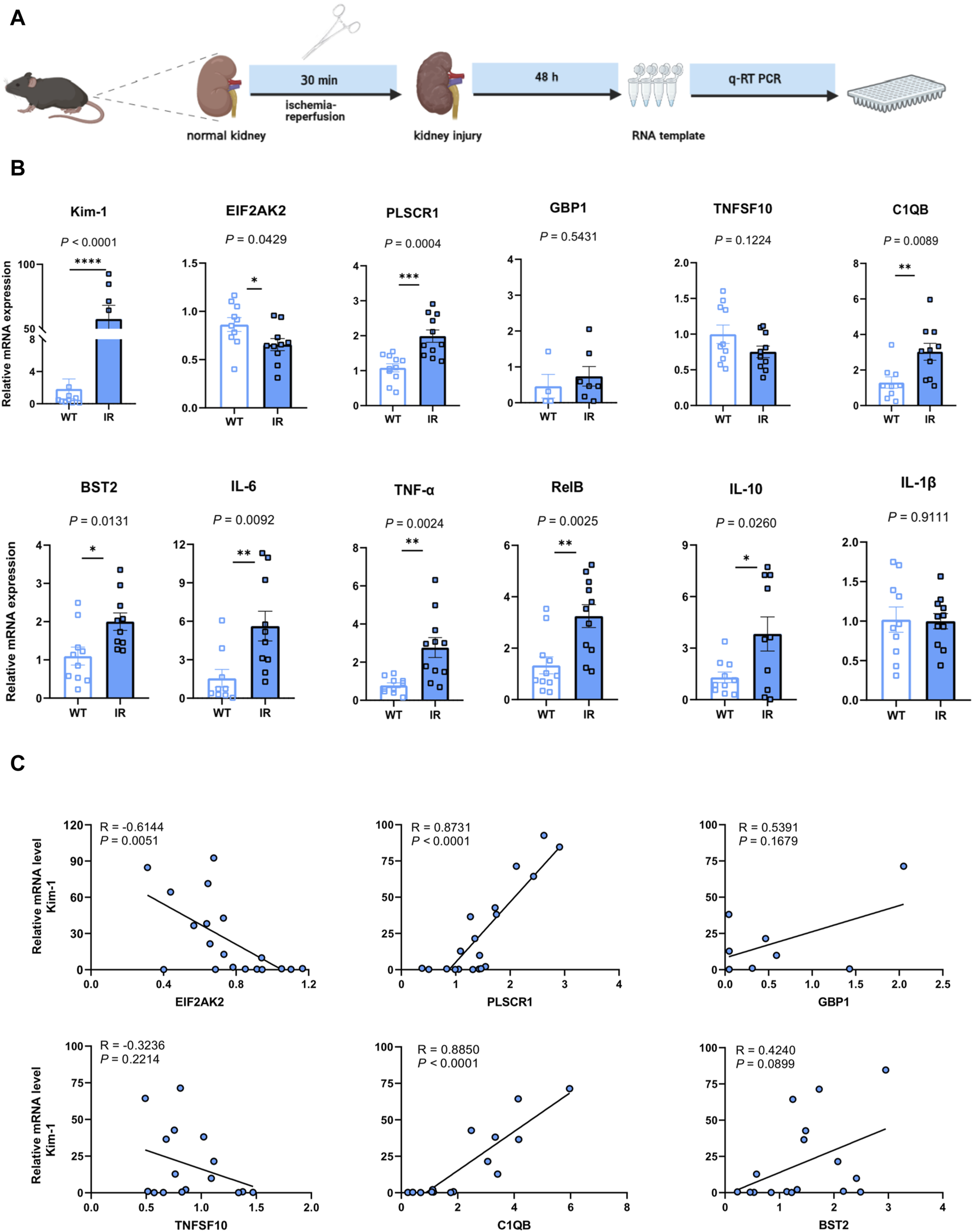 To evaluate the potential application of the identified hub genes as predictive biomarkers for AKI, we employed murine models subjected to IR-induced AKI (Figure 5A). In comparison to the control group, the AKI mice showed substantial elevations in the levels of PLSCR1, BST2, C1QB, Kim-1, IFN-γ, TNF-α, RelB, and IL-10, whereas a decline was observed for EIF2AK2 (Figure 5B). Importantly, EIF2AK2 showed a negative relationship with the key AKI mediator, Kim-1 (Han et al., 2002; Ix and Shlipak, 2021), while PLSCR1, and C1QB manifested a positive correlation with the same (Figure 5C).