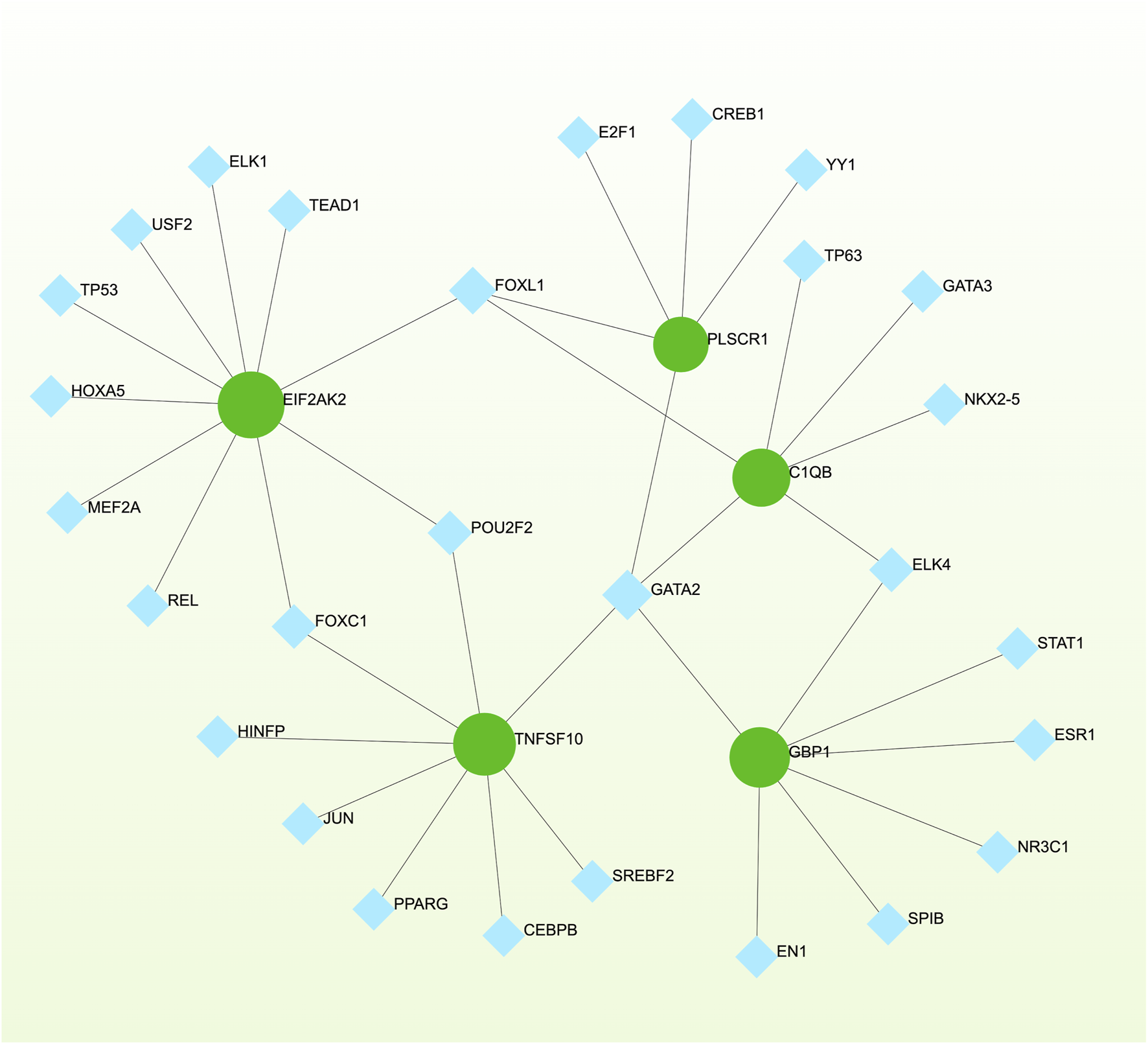 The regulatory interaction network, generated using Network Analyst, showcases the interconnected relationship between differentially expressed genes (DEGs) and transcription factors (TFs). In the network, TFs are represented by blue nodes, while the interaction between gene symbols and TFs is depicted by green nodes.