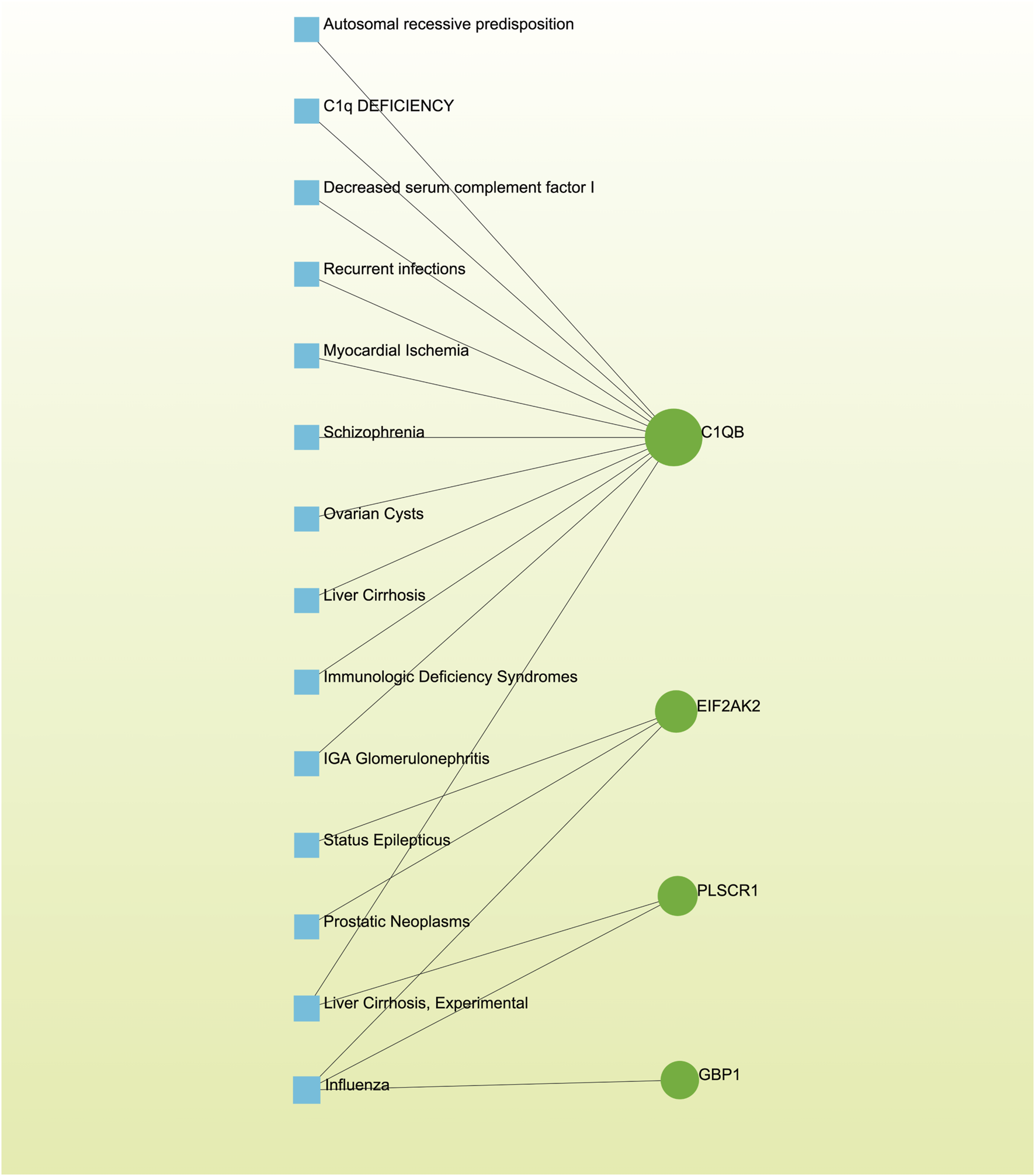 The gene-disease association network illustrates the connections between genes and diseases. In this network, diseases are represented by blue square nodes, while the gene symbols that interact with the respective diseases are denoted by green circle nodes.