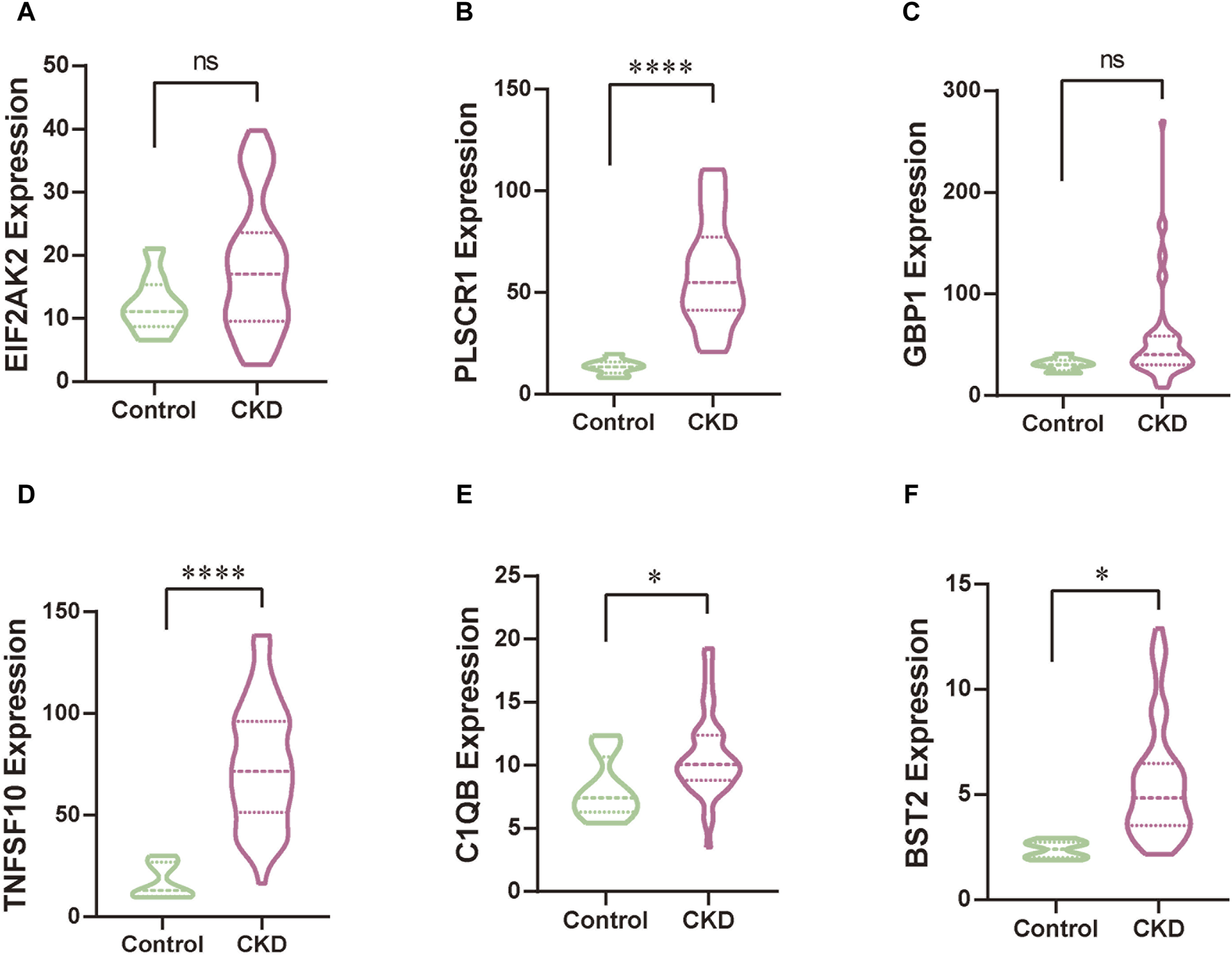 We leveraged a publicly available dataset to further validate the expression profiles of our focal hub genes in patients with KD. Through comparative analysis, we observed elevated expression levels of EIF2AK2, PLSCR1, GBP1, TNFSF10, C1QB, and BST2 in patients with KD (Figure 9). Among these results, the expression patterns of PLSCR1, GBP1, BST2, and C1QB were consistent with our initial research trends. However, the trends for EIF2AK2 and TNFSF10 deviated from our initial findings, which could be attributed to the comparatively intricate regulatory networks governing these genes. In our next steps, we aim to further explore the specific mechanisms underlying these discrepancies.