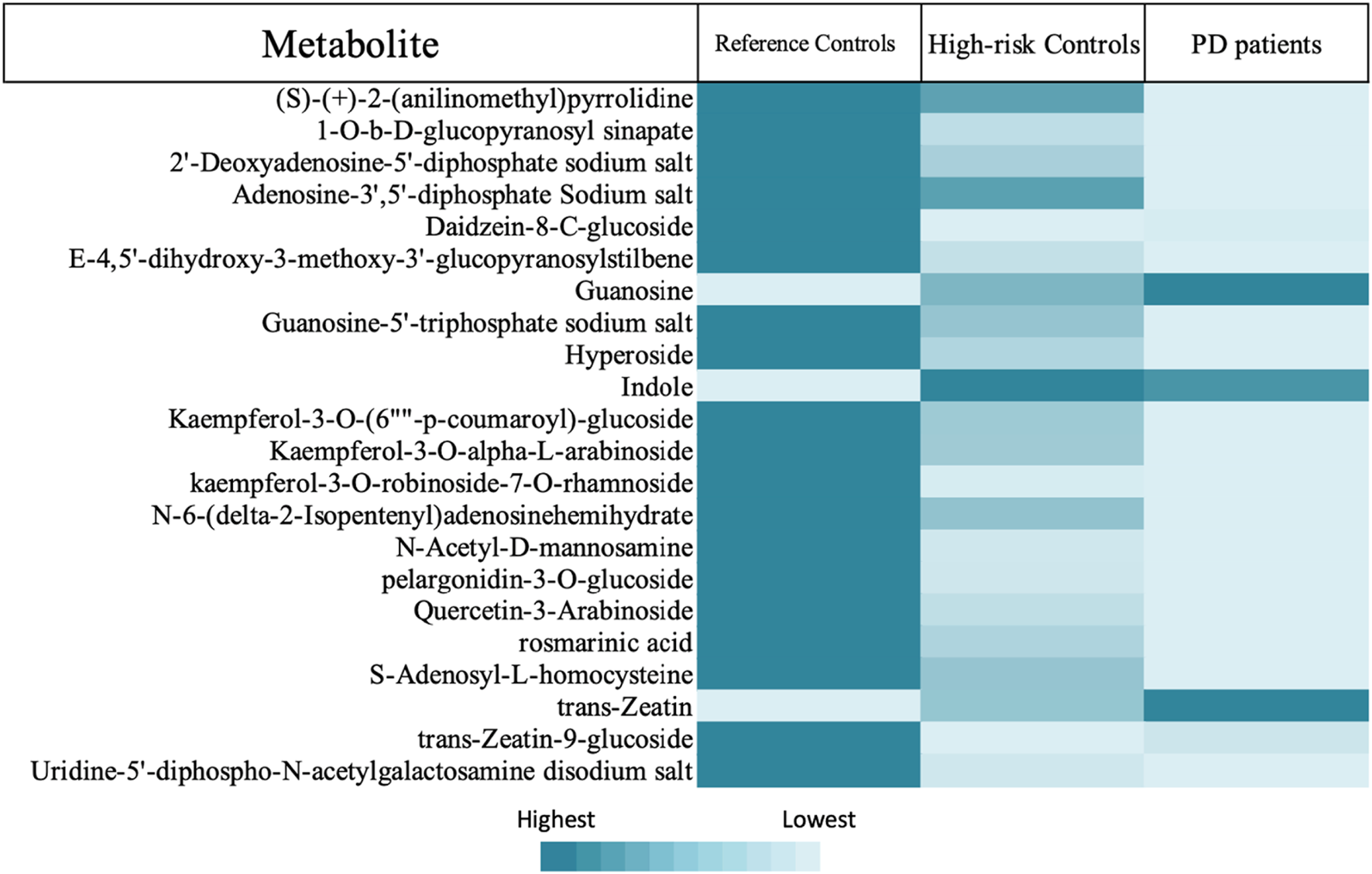 Methods: In this study, we have collected plasma from 27 PD patients, 18 reference controls, and 8 high-risk controls to perform a metabolomic study using liquid chromatography-electrospray ionization–tandem mass spectrometry (LC-ESI-MS/MS).