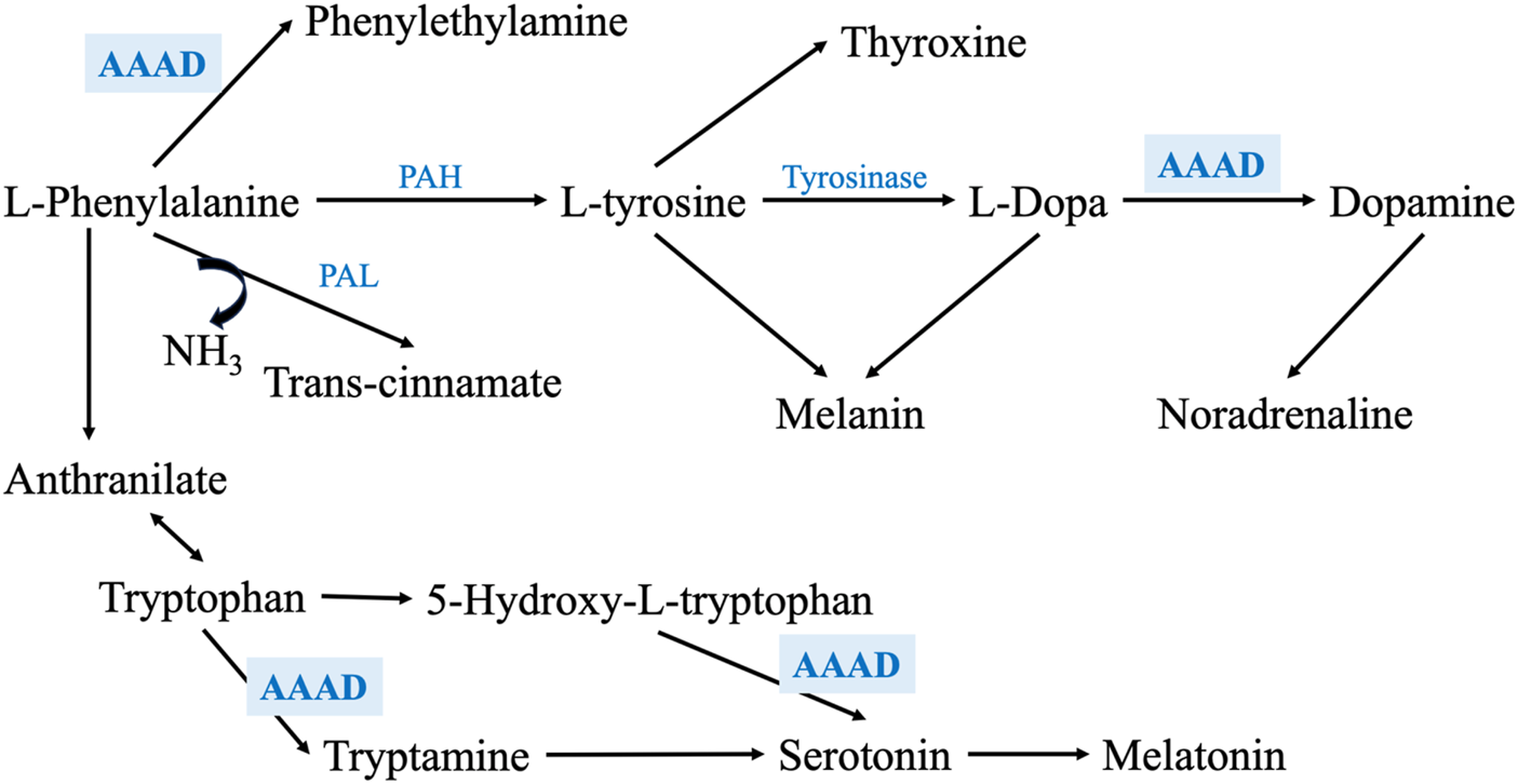On the other hand, AAAD is involved in the metabolism of several of the assayed metabolites. For example, it metabolizes phenylalanine into phenylethylamine, L-Dopa into DA, tryptophan into tryptamine, and 5-hydroxytryptophan into serotonin (Figure 6) (Zhu et al., 1992; Gücüyener et al., 2014); thus, any alteration in this enzyme’s levels may impact the metabolism of these metabolites. As the regulation of any enzyme is affected by the concentration and the availability of its substrate (Aragón and Sols, 1991), the expression and/or activity of AAAD may be altered in PD due to the deficiency of phenylalanine and L-Dopa, which, may affect the metabolism of tryptophan and the synthesis of serotonin and, its metabolites such as melatonin. Moreover, pyridoxamine and pyridoxal 5′-phosphate (PLP) are 2 interchangeable forms of vitamin B6 in the human body (Oppici et al., 2015). PLP, the active form of vitamin B6, is a cofactor for several B6-dependent (PLP-dependent) enzymes involved in many vital cellular processes. One of these enzymes is AAAD (Al Mughram et al., 2022).