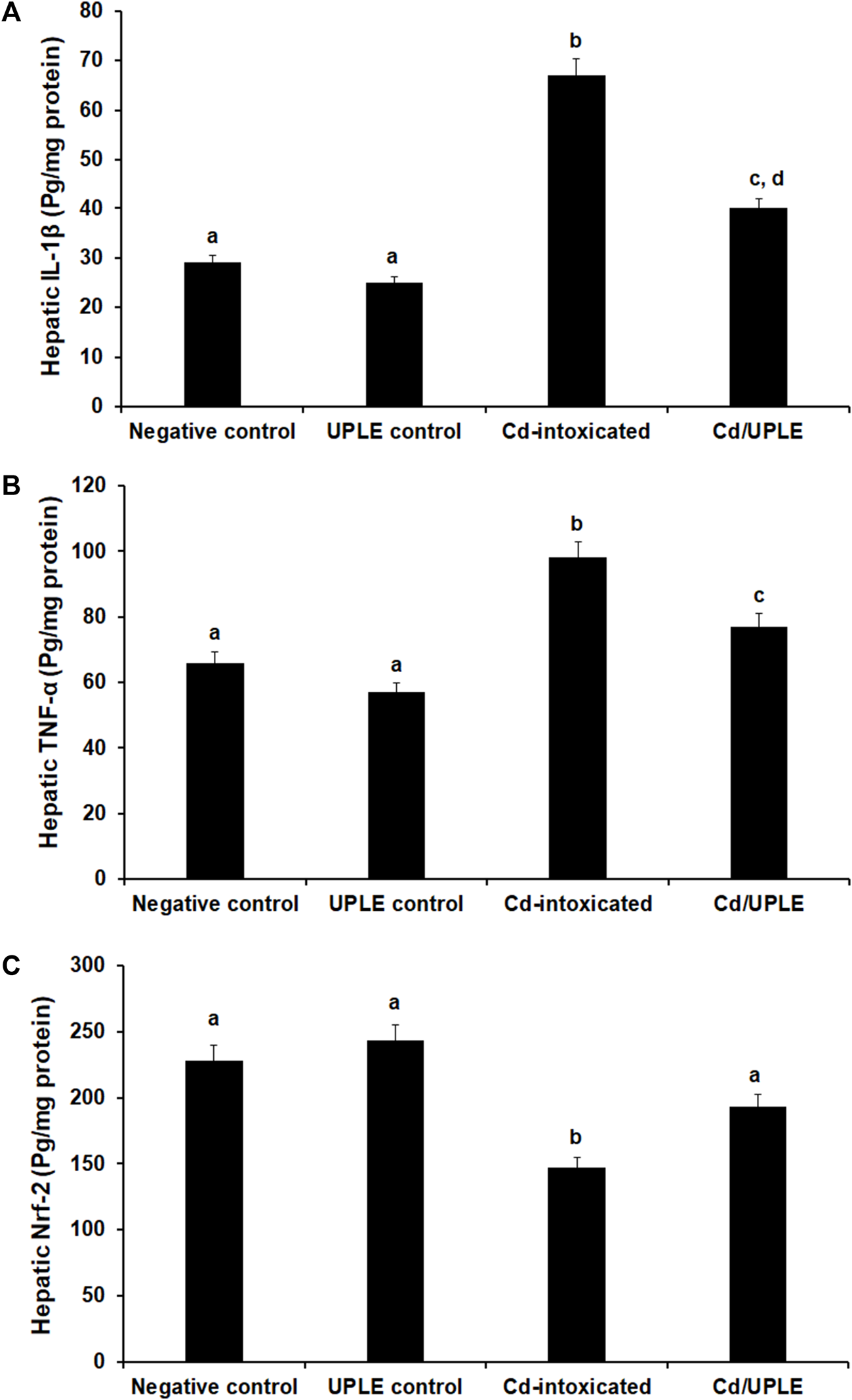 Discussion: This study explored the beneficial role of UPLE treatment in Cd-induced liver injury through enhancing Nrf-2 signaling and antioxidant enzyme gene expression in the liver of mice. Therefore, UPLE could have valuable implications against hepatotoxicity induced by environmental cadmium exposure. Which can be used as a chelating agent against Cd.