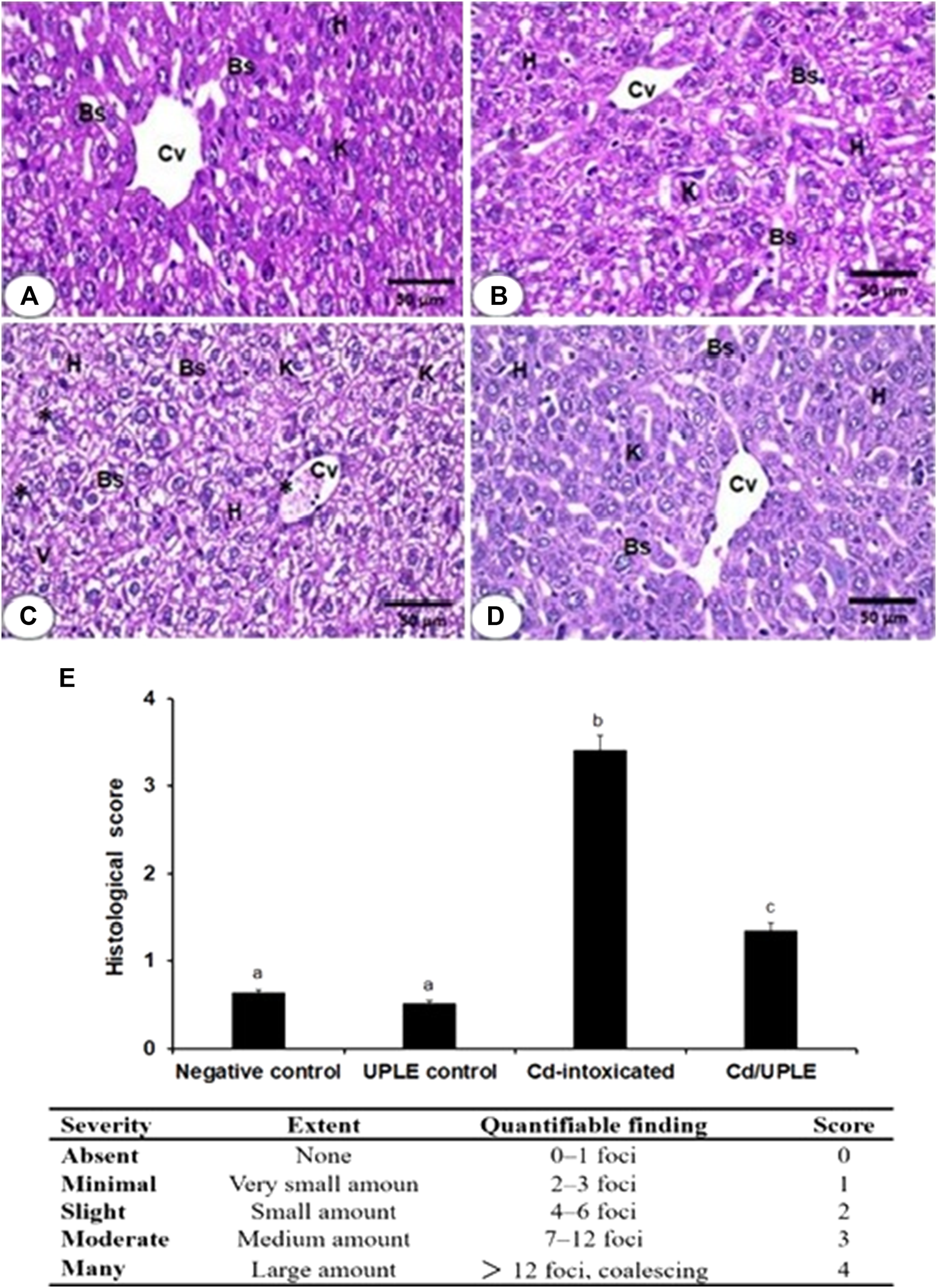 Compared to the control groups, the group treated with CdCl2 alone showed higher concentrations of Cd in the liver tissue (0.56 ± 0.08 μg/g wet tissue) (Figure 4). Treatment with UPLE affected Cd concentrations in liver of mice treated with CdCl2 by significantly decreasing (p ≤ 0.05) Cd concentration compared to those in the Cd-intoxicated mice without treatment.
