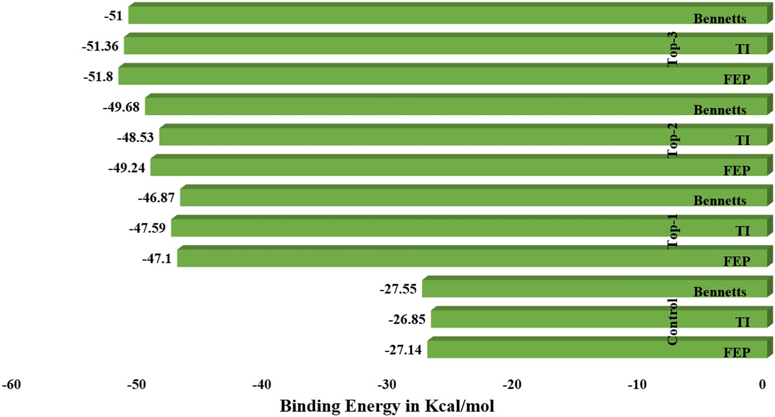 WaterSwap was carried out to calculate the binding energies of the complex along with solvated systems inside the cavity. WaterSwap samples conformational space using MC simulations [using the Sire program (Woods et al., 2014)]. To begin the MC computation, a starting configuration is necessary, which is commonly obtained via MD simulations of the protein–ligand complex (Ahmad and Azam, 2020a). WaterSwap computations were used to construct the most representative structures from the ensemble obtained by the MD simulations. The free energy was then calculated for all three complex systems along with the control system using the free energy perturbation (FEP) (Zwanzig, 2004), thermodynamic integration (TI) (Oostenbrink et al., 2000), and Bennett acceptance ratio (BAR) (Bennett, 1976) methods. Three approaches were chosen to calculate free energy because the similarity of the energy values obtained from these methods indicates the dependability and convergence of the results.
