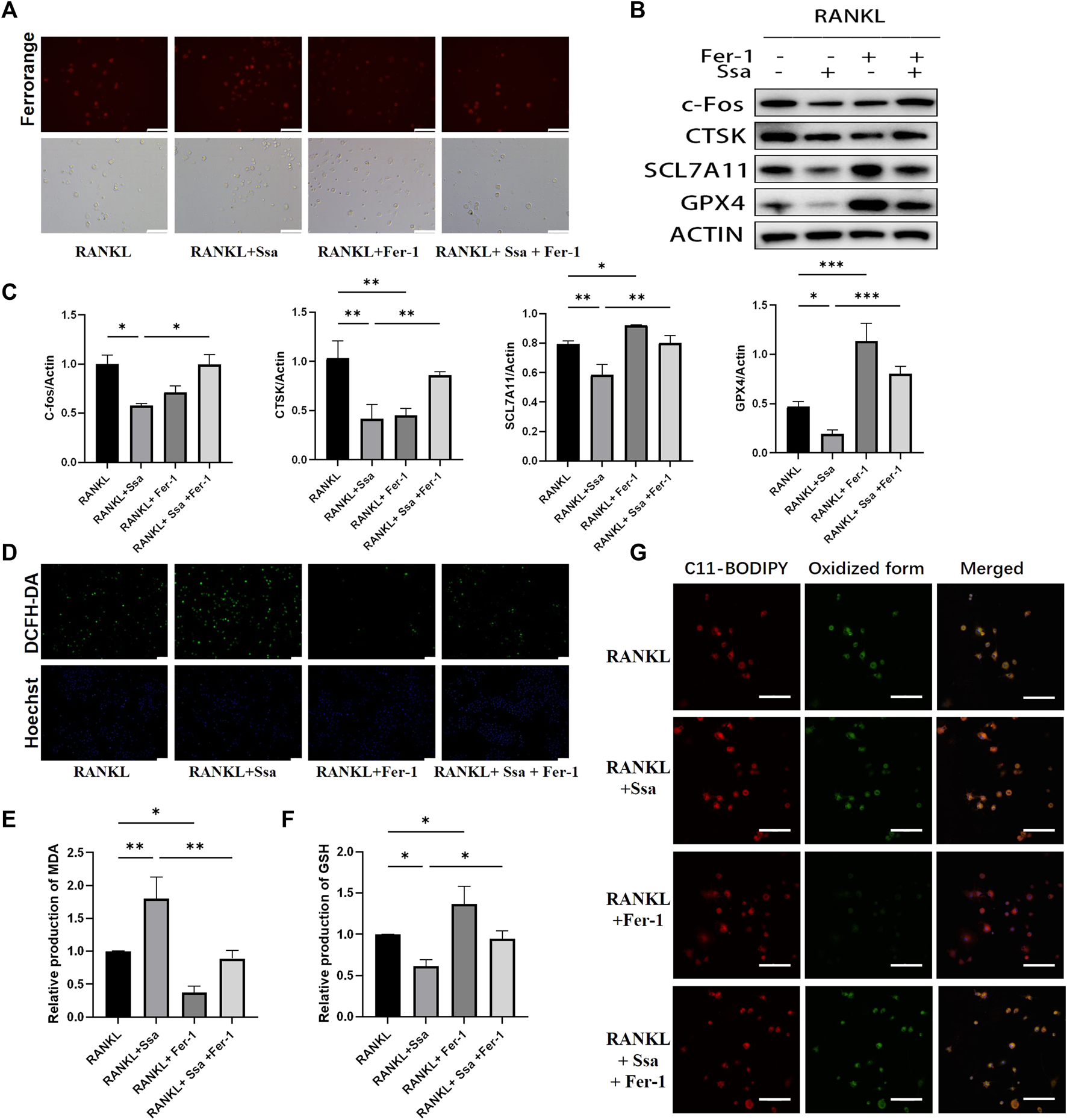 Figure 5. Ferroptosis is involved in Ssa inhibition of osteoclast differentiation. (A) FerroOrange staining. Scale bars = 100 μm. (B–C) Western blotting assay of CTSK, c- Fos, Nrf2, SLC7A11, and GPX4 levels and their quantification. (D) DCFH-DA. Scale bars = 100 μm. (E) MDA. (F) GSH. (G) BODIPY 581/591 C11. Scale bars = 20 μm. In the graphs, data are displayed as the mean ± SD (n = 3). *p < 0.05; **p < 0.01 and ***p < 0.001.