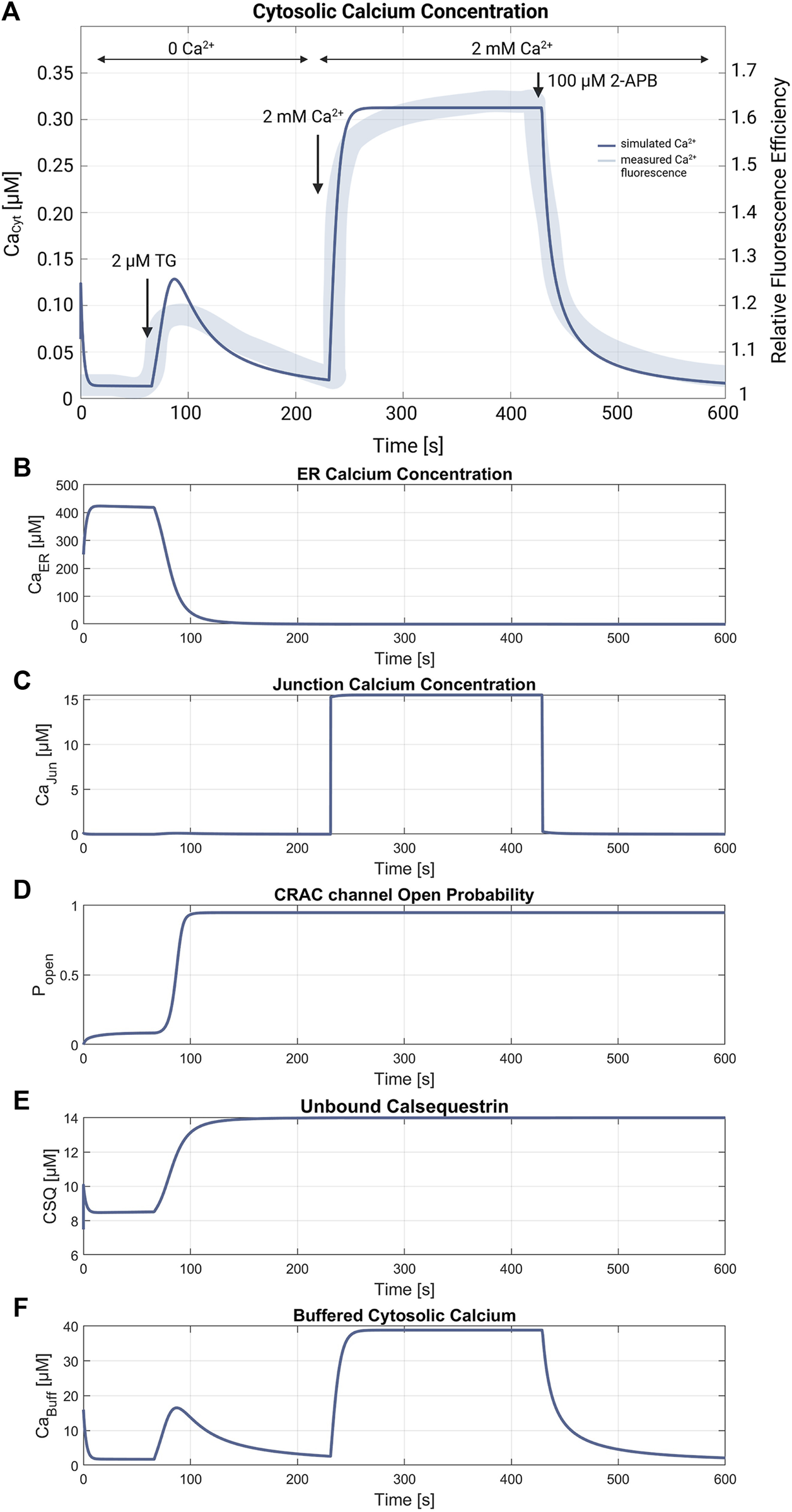 Figure 5. SOCE model verification. (A) Cytosolic calcium concentration simulation using the SOCE model (thin line in blue) superimposed with the measured calcium fluorescence from the experiment by Hou et al., 2011 (cf. Figure 5C in Hou et al., 2011) (thick line in blue). The arrows mark the addition of 2 µM Thapsigargin (TG) to block the SERCA pumps, start of perfusion of the cells with 2 mM Ca2+, and addition of 100 µM 2-APB, a store-operated calcium channel blocker. Simulation of the relevant SOCE parameters (B) [Ca2+]ER; (C) [Ca2+]Jun; (D) CRAC channel open probability; (E) Ca2+ unbound calsequestrin; and (F) buffered Ca2+ in the cytosol.
