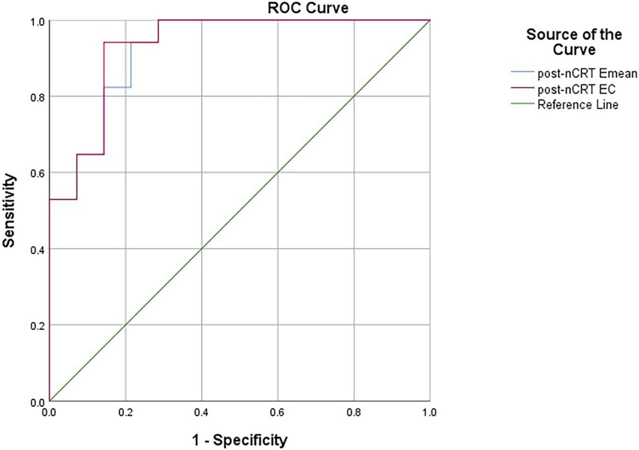 Only one patient each had ypT1 and ypT4 stage, respectively. Therefore, for analysis, ypT1 and ypT2 with tumors confined to the intestinal wall were grouped into the ypT1-2 group, and ypT3 and ypT4 with tumors invading the outside of the intestinal wall were grouped into the ypT3-4 group. Table 2 lists the Emean and EC values in each group after nCRT. After nCRT, the Emean and EC values increased with increasing tumor stage, and the Emean and EC values of lesions at different pathological stages were significantly different (p = 0.006). There were statistically significant differences between the ypT0 and ypT1-2 groups (p = 0.031) and between the ypT0 and ypT3-4 groups (p < 0.001), whereas the ypT1-2 and ypT3-4 groups showed no significant difference (p = 0.686).