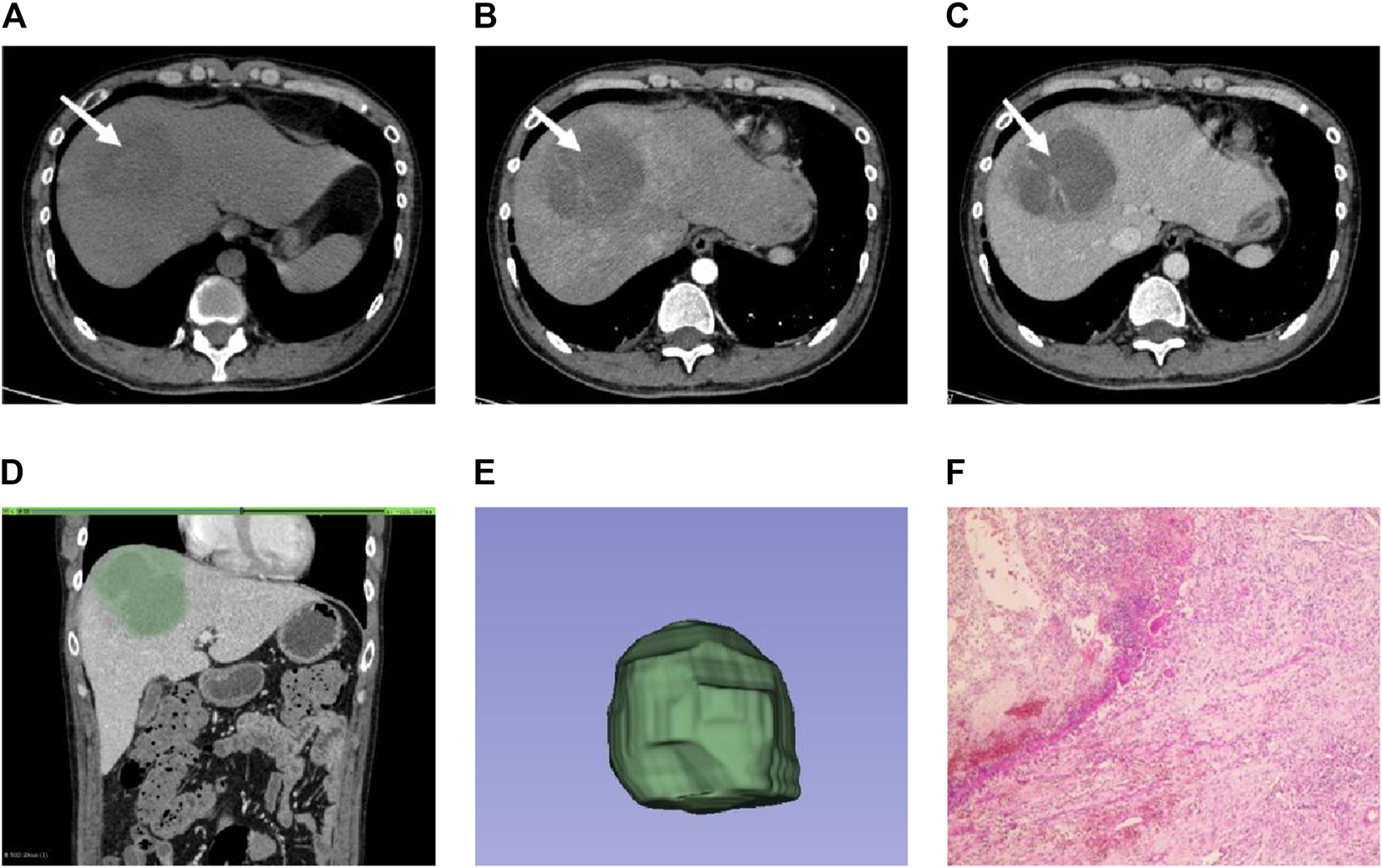 Male individual, 65 years old, ICC (A–C). The lesions were located in the right lobe of the liver (white arrow). The enhancement was uneven in the arterial phase. The enhancement in the venous phase was high and showed centripetal enhancement (D). ROI is outlined on the largest level of the lesion in the venous phase (E). 3D view of the lesion (F). Pathological findings showed irregular glandular tubular and strip-like interstitial infiltration with obvious cell atypia, which was consistent with moderately differentiated intrahepatic cholangiocarcinoma (HE × 100).