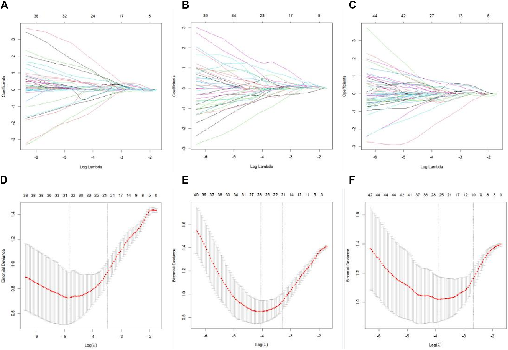 LASSO regression feature screening graph. A 10-fold cross-verified LASSO regression was used to screen the radiomics features, and the optimal parameter λ was selected (A–C). Curves of the changes in the radiomics feature coefficients with λ in the plain scan phase, arterial stage, and venous stage models, respectively. The dotted line indicates the location of the selected optimal λ (D–F). Curves of the mean square error of the model in plain scan phase, arterial phase, and venous phase with λ, respectively. The dashed line represents standard deviation of 1 and the location of the selected optimal λ.