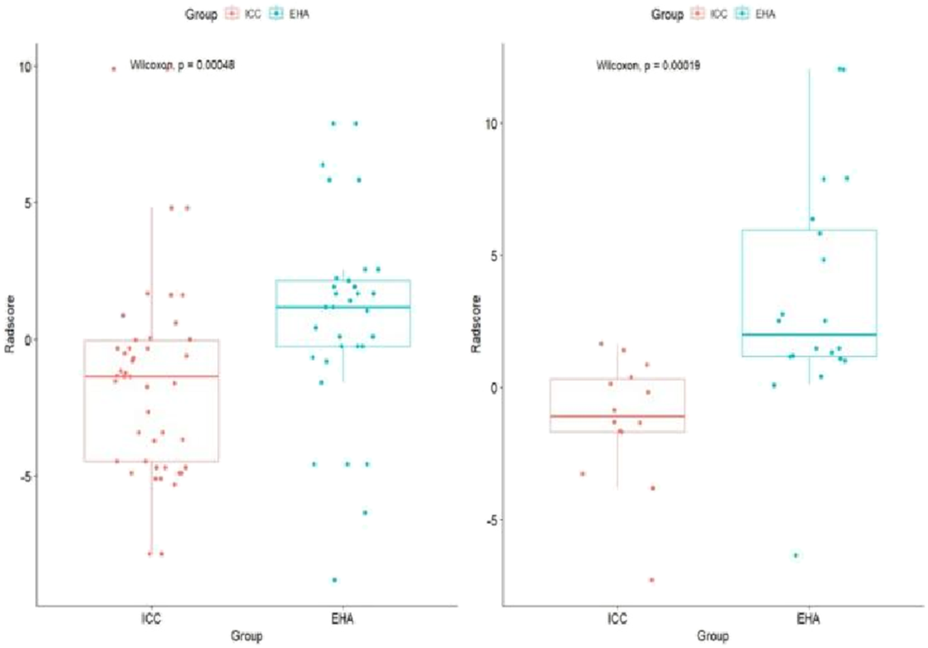Clinical and imaging data on 112 patients diagnosed with EHA and ICC who underwent double-phase CT-enhanced scanning at our hospital were collected. The contours of the lesions were delineated layer by layer across the three phases of CT scanning and enhancement using 3D Slicer software to define the region of interest (ROI). Subsequently, the contours were merged into 3D models, and radiomics features were extracted using the Radiomics plug-in. The data were randomly divided into training (n = 78) and validation (n = 34) cohorts at a 7:3 ratio, using the R programming language. Standardization was performed using the Z-score method, and LASSO regression was used to select the best λ-value for screening variables, which were then used to establish prediction models. The rad-score was calculated using the best radiomics model, and a joint model was constructed based on the rad-score and clinical scores. A nomogram was developed based on the joint model. The diagnostic efficacy of the models for distinguishing ICC and EHA was assessed using receiver operating characteristic (ROC) curve and area under the curve (AUC) analyses. Calibration curves were used to evaluate the reliability and accuracy of the nomograms, while decision curves and clinical impact curves were utilized to assess their clinical value.