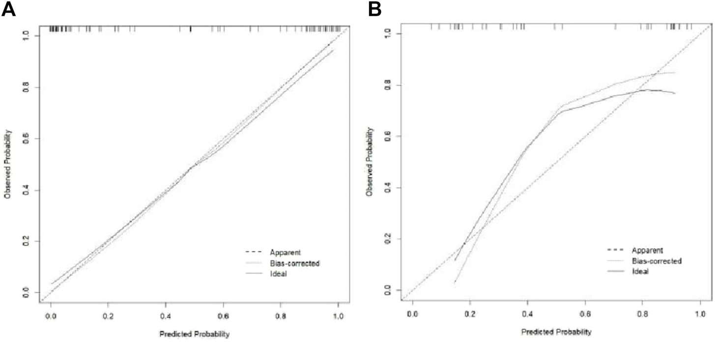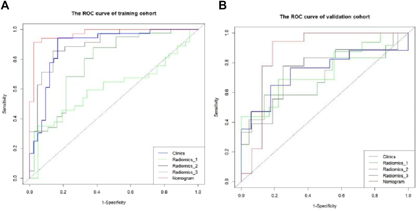 R 4.3.1 software was utilized to assess the normality of measurements in the dataset using the Kolmogorov–Smirnov test. Levene’s test was used to assess the homogeneity of variances. For normally distributed data, t-tests were conducted (homogeneous variance) or Welch’s t-tests were applied (heterogeneity of variance). Non-normally distributed data were analyzed using Wilcoxon’s rank-sum test, with results expressed as x ± s. Categorical data were analyzed using the chi-squared test or Fisher’s exact test for special variables, with frequencies reported as n (%). Single-factor and multi-factor logistic regression analyses were performed to identify independent influencing factors and construct various models in both the training and validation cohorts. Receiver operating characteristic (ROC) curves were utilized to analyze and calculate the cutoff value, Jordon’s index, sensitivity, specificity, and area under the curve (AUC) with a 95% confidence interval (CI) for each model. Based on the joint model, column line graphs were generated using R software. Calibration curves were plotted after 1,000 repetitions using the bootstrap self-sampling method to visually evaluate the predictive performance of the column line graphs. Decision curves and clinical impact curves were plotted to evaluate the clinical utility of the column line graphs. Statistical significance was set at p < 0.05.