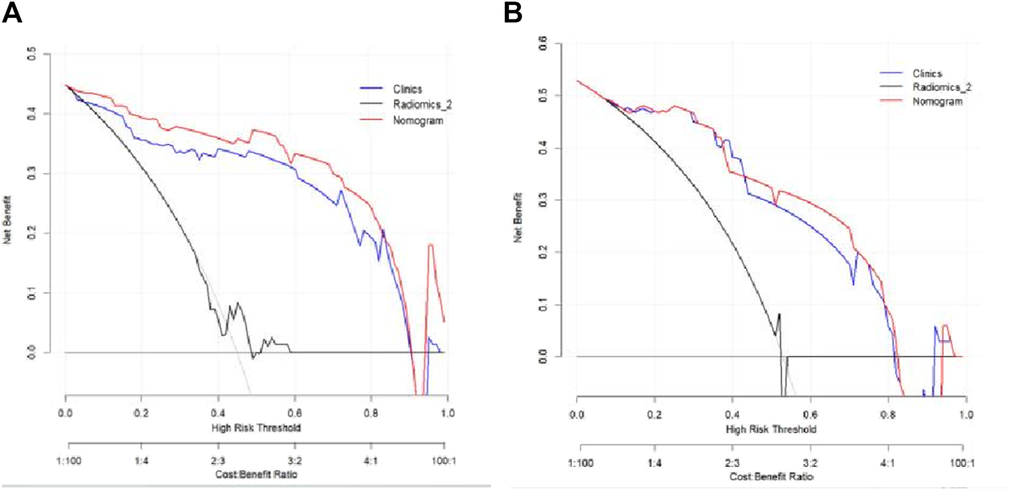 Hepatic abscesses are relatively common in clinical practice, and their imaging characteristics vary depending on the stage of the disease. In recent years, the imaging features of early hepatic abscess (EHA) have become increasingly atypical, possibly due to antibiotic misuse (He et al., 2022). The absence of central uniform necrotic areas, ring target signs, or gas–liquid interfaces within the lesions makes it challenging to definitively diagnose EHA, often leading to misdiagnosis as tumorous lesions (Zhuo et al., 2021; Khim et al., 2019). Intrahepatic cholangiocarcinoma (ICC), the second most common primary malignant liver tumor, arises from the epithelial cells of the bile ducts. It exhibits an insidious onset, accounting for approximately 15% of liver cancer cases. ICC presents with various imaging features, including clinical fever and honeycomb changes in some cases (Hu et al., 2022; Entezari and Riaz, 2020). Therefore, an accurate preoperative diagnosis of ICC significantly influences treatment options and patient prognosis. Radiomics, a machine learning-based method introduced by Kumar in 2012, allows for the extraction of high-throughput radiomics features (>100 features) from conventional images to quantify lesions. This emerging technology has gained widespread use in recent years (Kumar et al., 2012; Chassagnon et al., 2023). However, there are limited reports in the literature regarding the application of CT-enhanced scanning radiomics nomograms for differentiating and identifying liver lesions. This study aims to establish CT-enhanced scanning radiomics nomograms and assess their clinical utility in distinguishing EHA from ICC.