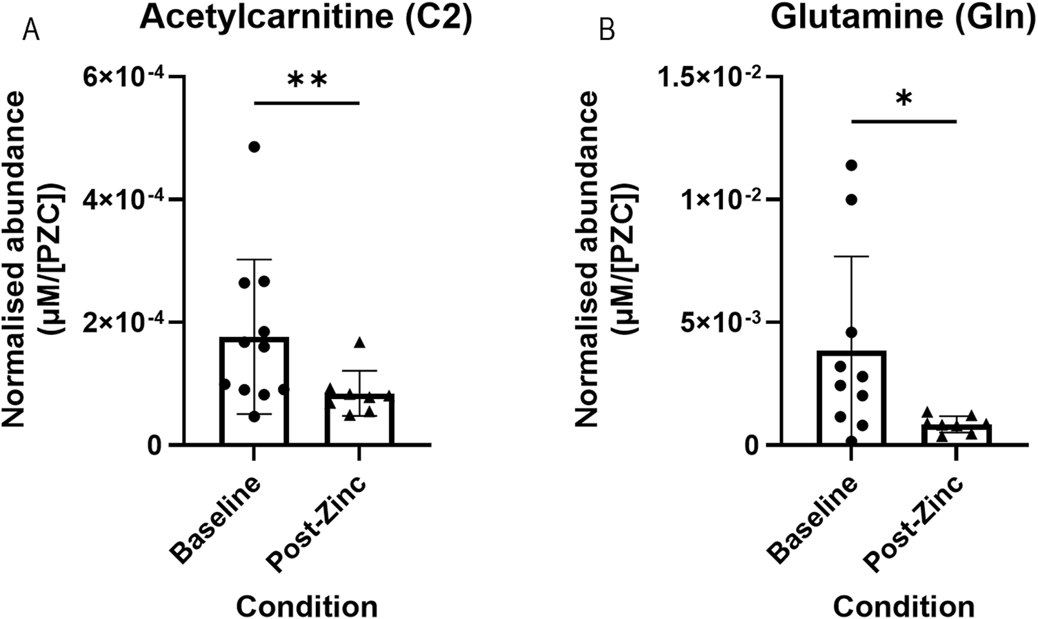 Representative bar graphs of metabolites collected from tears in the BiZiFED study that showed a significant difference in abundance between baseline and post-zinc supplementation in a zinc-deficient population. Metabolites are: acetylcarnitine (C2) (A) and glutamine (Gln) (B) (n = 7-9 tear samples per experimental condition, mean ± S.D., *p < 0.05, **p < 0.01, pairwise Wilcoxon signed rank test).