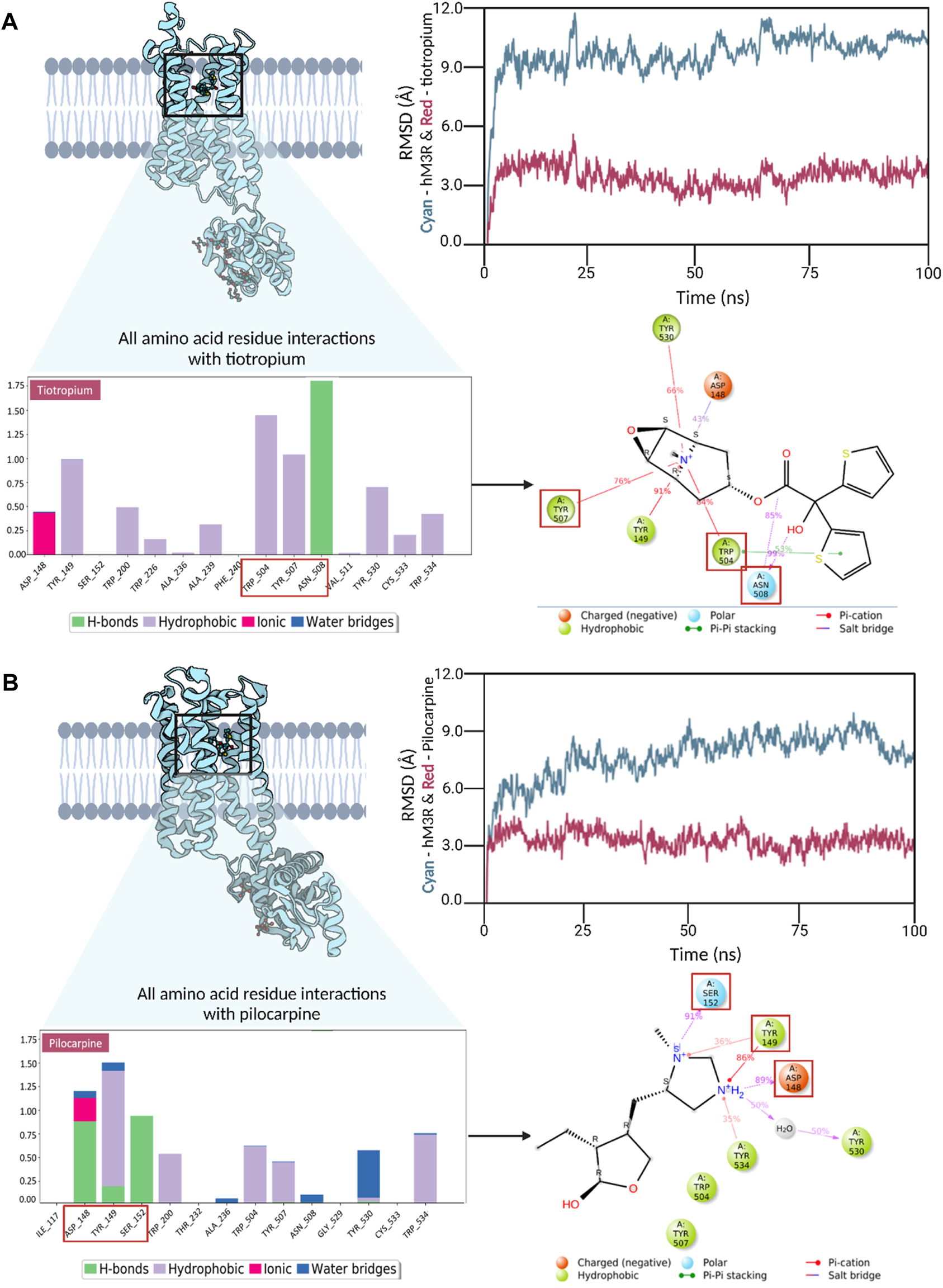 Trajectory analyses of molecular dynamics simulations for human M3R in complex with pilocarpine (A) and tiotropium (B). Root-mean-square-deviation (RMSD) analysis demonstrated stable interactions in both the pilocarpine-hM3R and tiotropium-hM3R complexes, with pilocarpine displaying a tighter binding, likely due to its lower molecular mass. Interaction fraction analyses were conducted to reveal all amino acid residue interactions observed during MD simulation. The bar diagrams for pilocarpine and tiotropium revealed TYR149 as a key contributor in both complexes, engaging in diverse interactions with pilocarpine and tiotropium. Notably, TRP504 exhibited a significantly higher interaction fraction with tiotropium compared to pilocarpine. The top binding residues differed in their locations, with pilocarpine-hM3R interactions upstream (148-152) and tiotropium-hM3R interactions downstream (504-508), as denoted by red boxes. Subsequent 2D Ligand-protein contact analysis was conducted to visualize these key binding interactions that occurred more than 30% of the simulation time. Red squares in the 2D diagram correspond to top binding residues identified from the interaction fraction analysis. Overall, these results underscore the significance of a positively charged tertiary amine in the binding process to human M3R, hinting at the potential of aromatic side groups to amplify antagonistic properties, especially through interactions with TRP504.